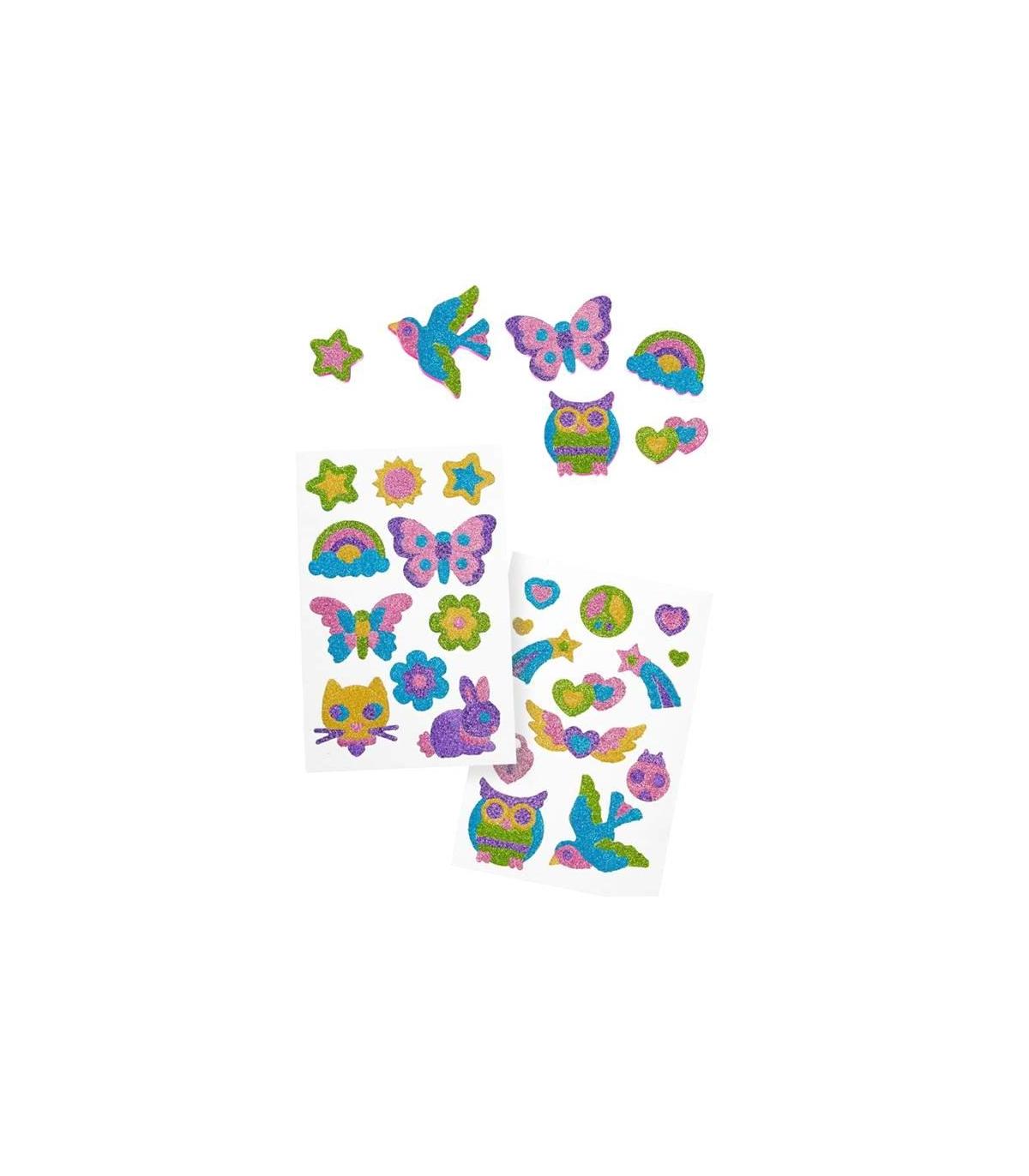 Con 23 pegatinas de espuma y 5 hojas de brillo, hay diversión en corazones, estrellas, arcoíris, animales en abundancia y mucho más.