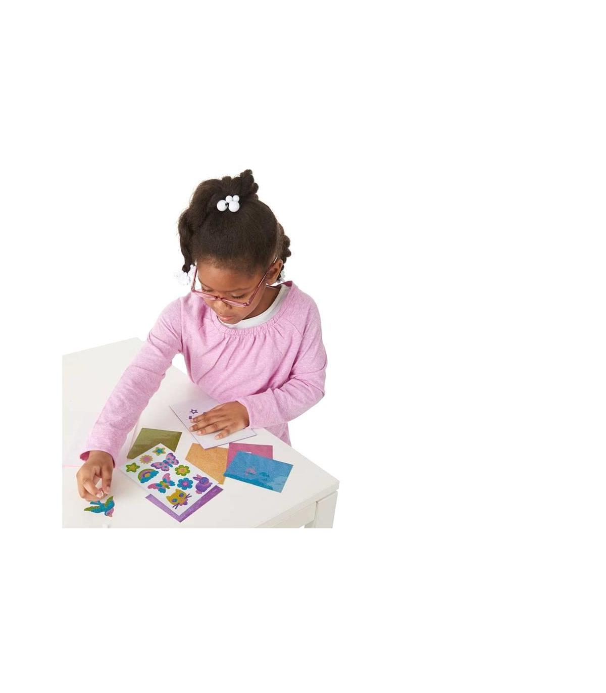 Simplemente retira una sección del papel blanco de las formas adhesivas para revelar la superficie pegajosa, luego seleccione una de las 5 hojas de brillo de diferentes colores y presiona para obtener un arte brillante instantáneo.