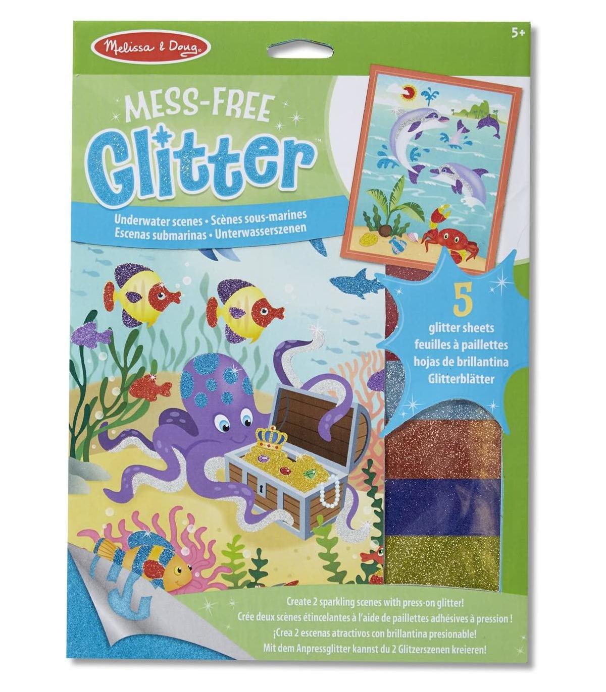 Haz 2 escenas de pegar y colocar brillo. Tiene el aspecto y la sensación de purpurina real sin hacer lío. Un proceso simple crea resultados increíbles. Incluye 5 hojas de purpurina. Apto para niños de aproximadamente 5 años.