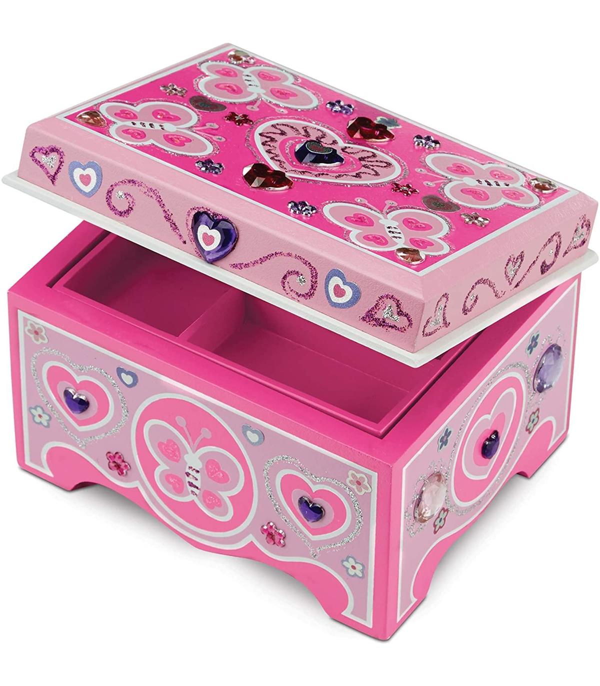 Incluye una caja de madera, 26 gemas adhesivas, 38 calcomanías metálicas, 3 tubos de goma con brillantina y goma blanca