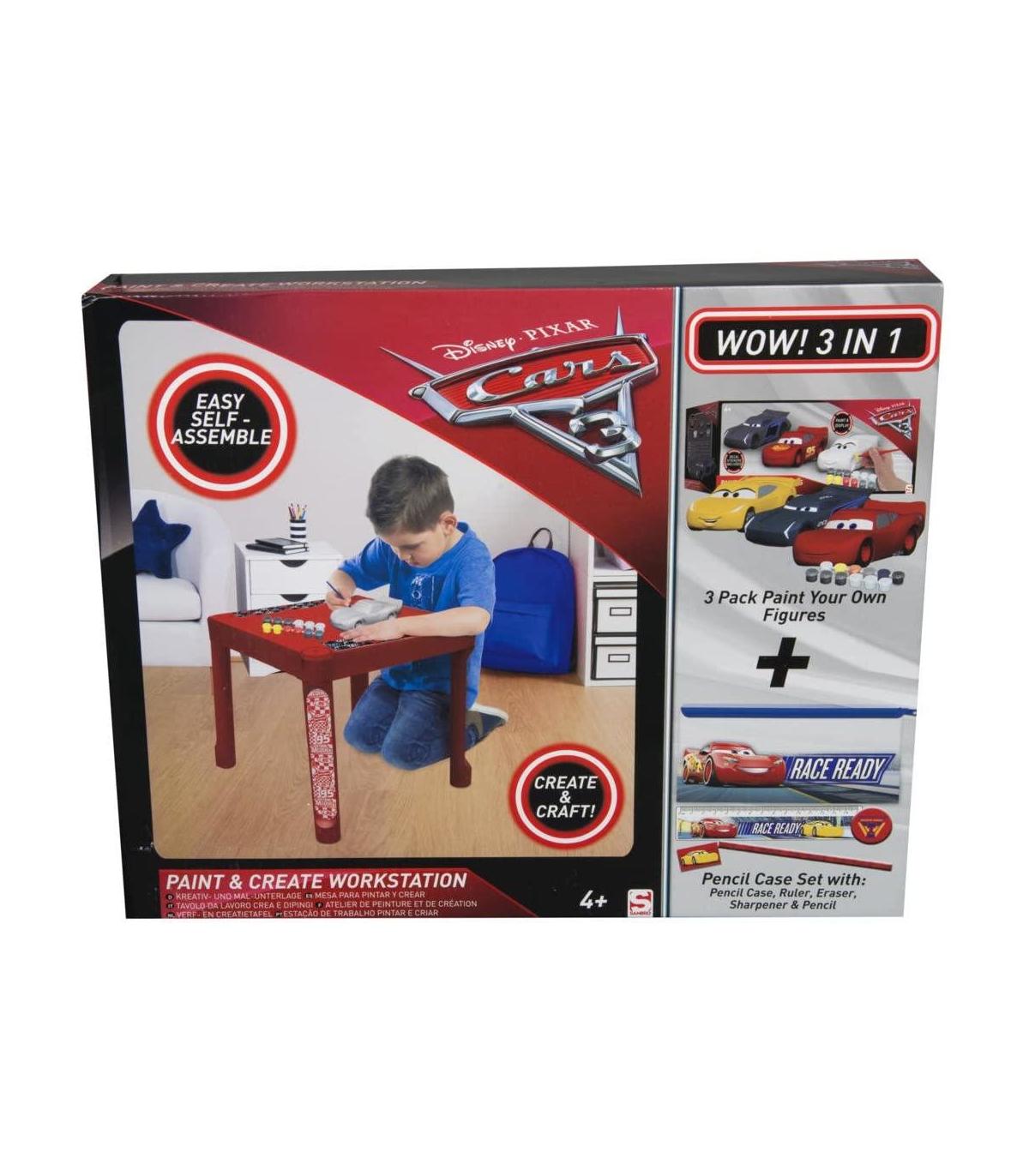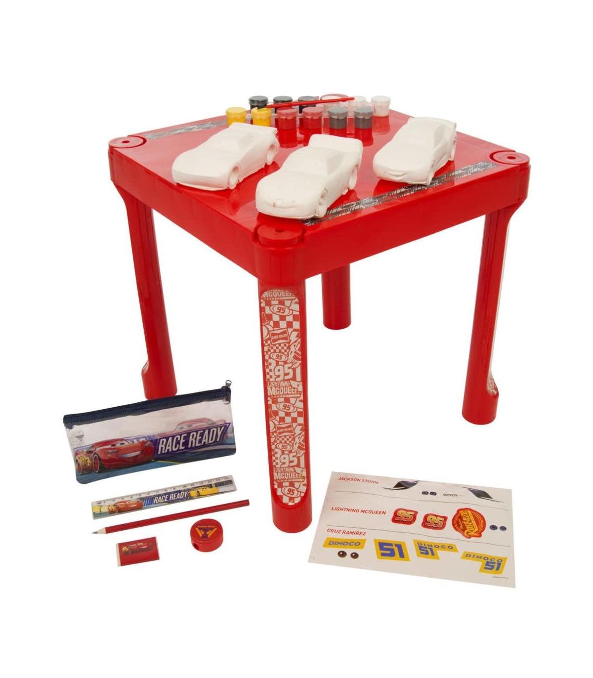 Este juego de Disney Cars 3 contiene una mesa para colorear, 3 unidades para pintar tus propios personajes y un estuche lleno y es ideal para inspirar la creatividad de tus pequeños. La mesa es fácil de montar y se puede transportar de una habitación a otra. El estuche relleno es ideal para que puedan dibujar y diseñar y para un bonito recuerdo para mostrar o dar como regalo, el juego de 3 figuras de Rayo McQueen de Cars 3 de Disney está listo para pintar con su propio diseño. Este set es ideal para fomentar el lado artístico de tu hijo y animarlos a usar su imaginación y al mismo tiempo darles horas de diversión. Los días lluviosos y las vacaciones escolares nunca han sido tan divertidos.