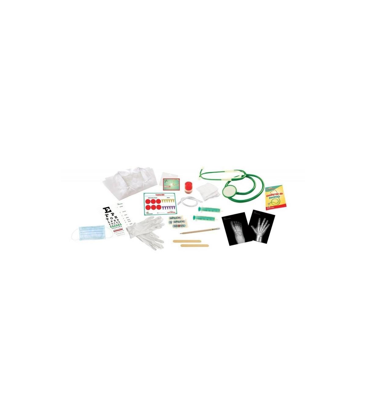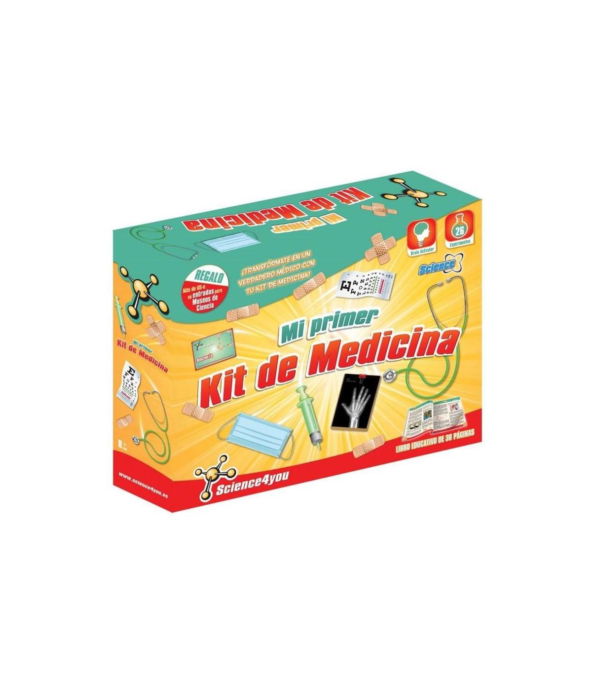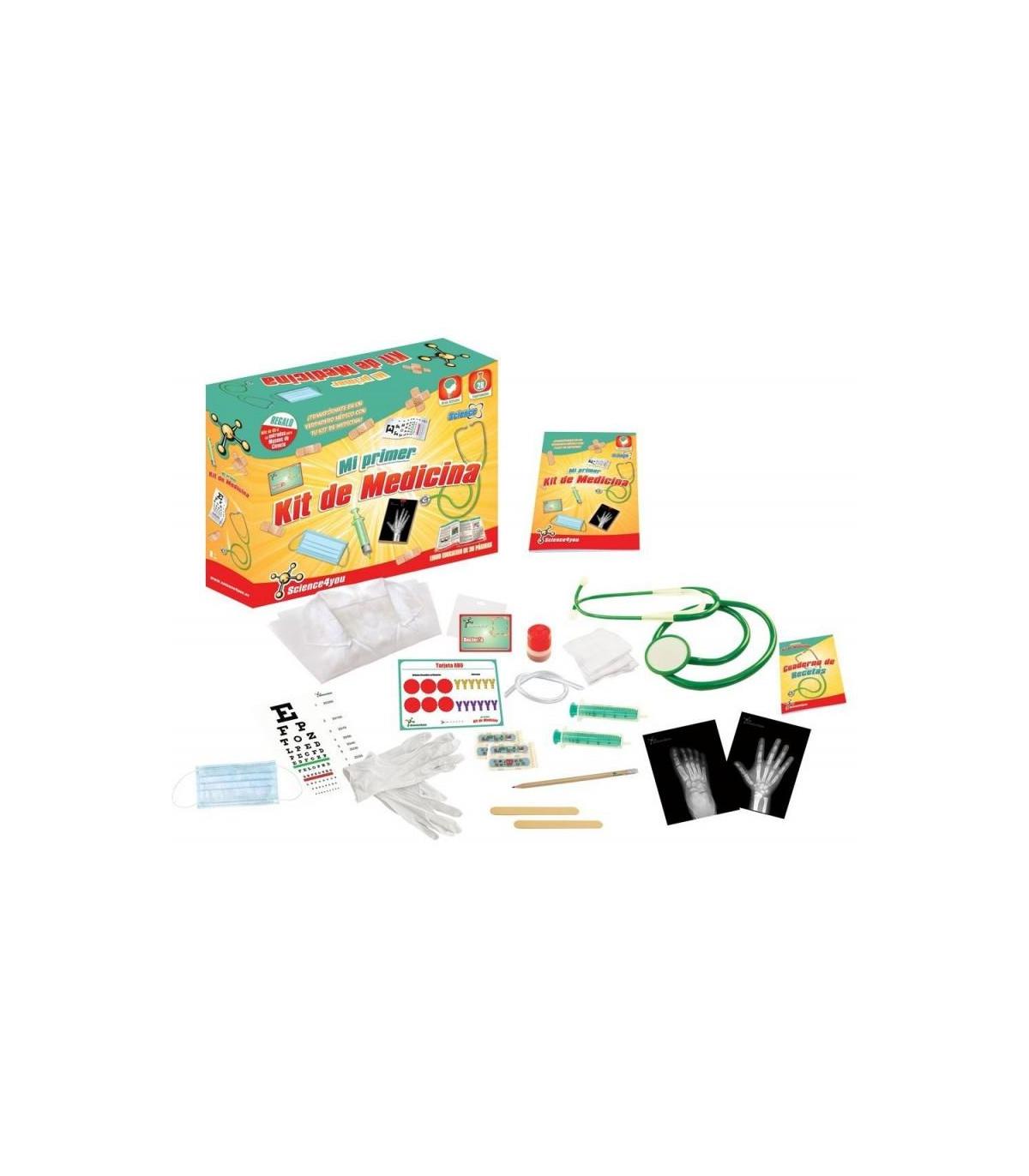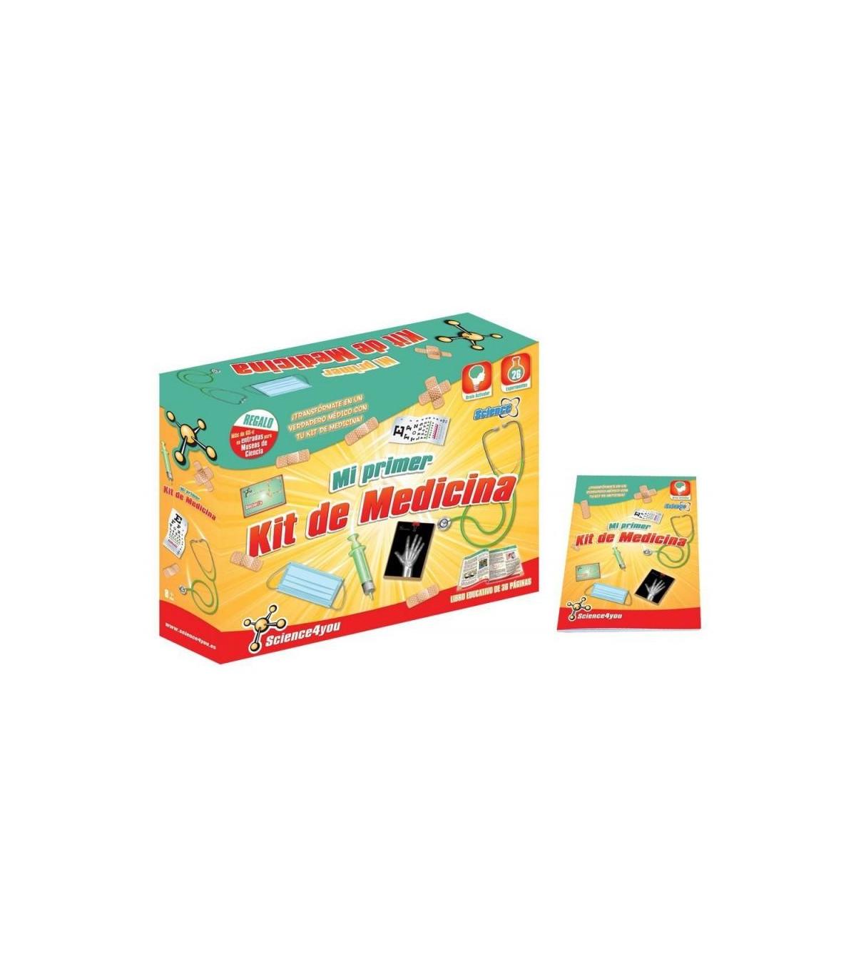 Edad recomendada +8 años. MI PRIMER KIT MEDICINA Libro educativo de 36 páginas Regalo de más de 100 € en entradas para Museos de Ciencia 26 experimentos ¡Transfórmate en un verdadero médico con tu kit de medicina! Bata, jeringas, guantes, radiografías, recetas... ¡No te faltará de nada!