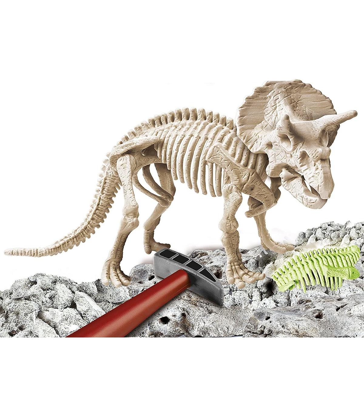 Conviértete en un auténtico paleontólogo Contiene martillo y cincel para realizar las excavaciones como un profesional Encuentra todos los huesos y monta el Triceratops fluorescente A partir de 7 años Juguete en español