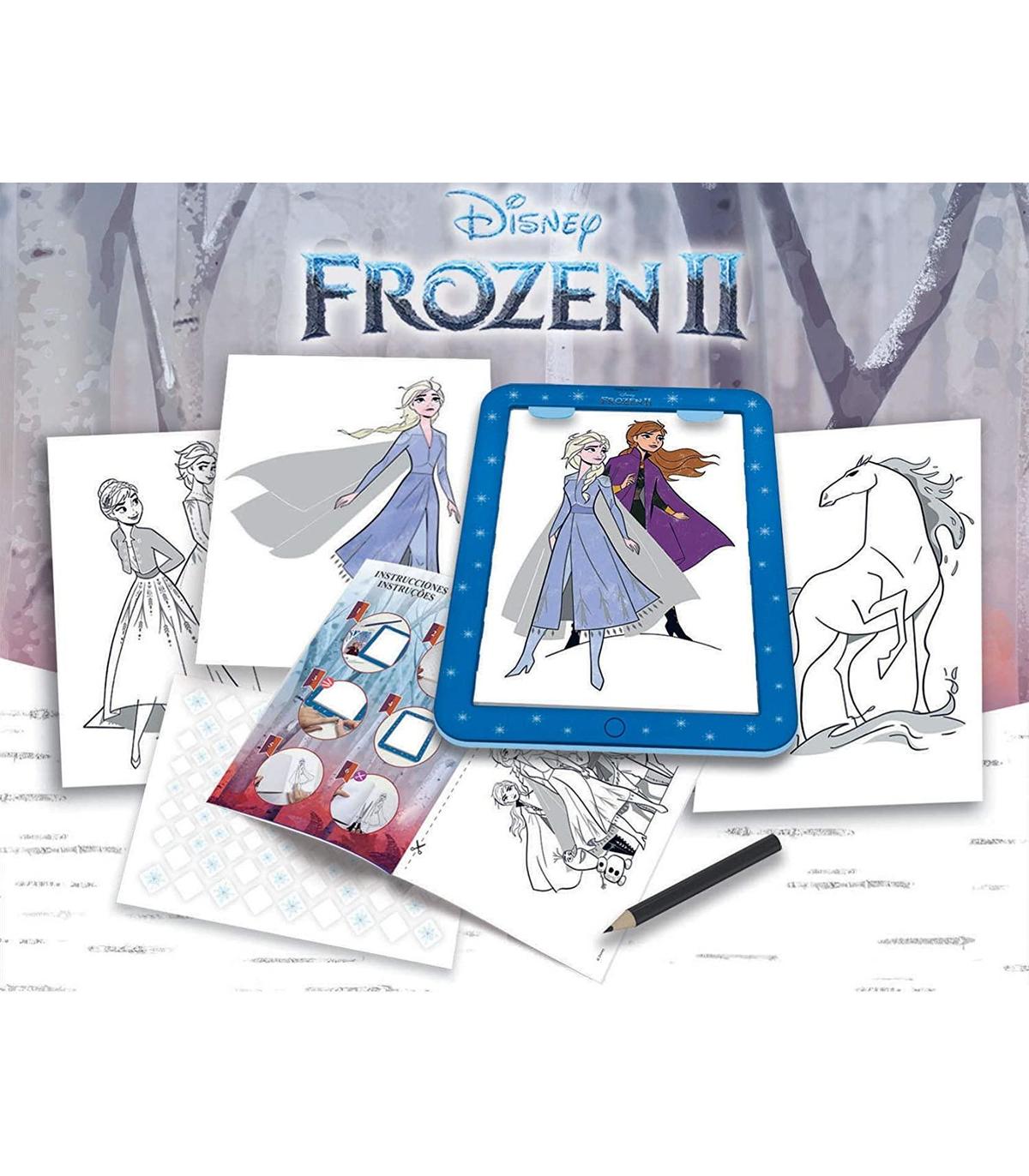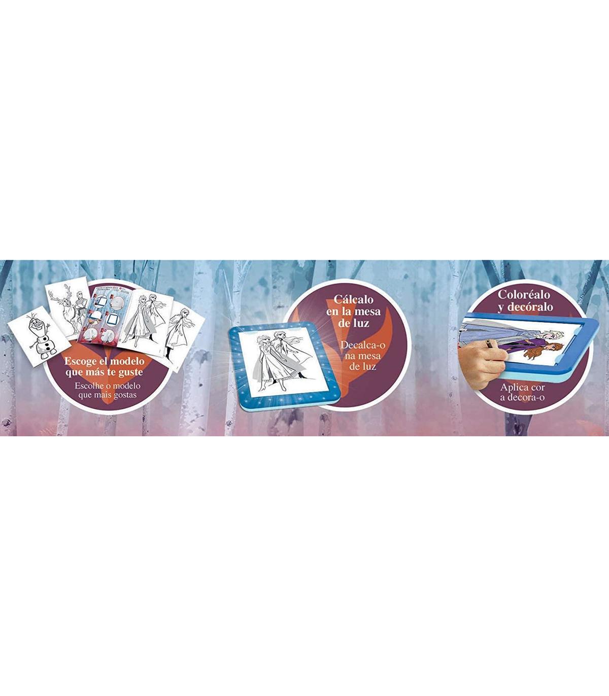Crea tus diseños de Frozen II con la mesa de luz, coloréalos y decóralos con los adhesivos