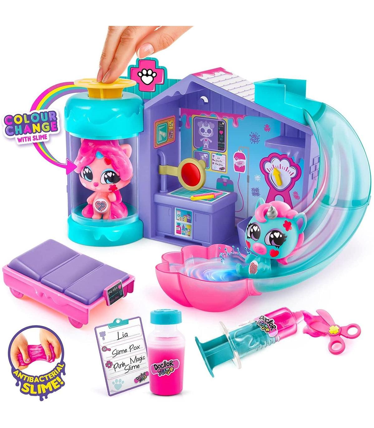 Este juguete tiene la particularidad de cambiar de color al contacto del slime y cuenta con un cuadro de diagnósticos. Dentro encontrarás una jeringa para el slime, una tierna mascota, un frasco de medicina donde viene el slime y una lupa para ver el diagnóstico. Todo esto en la maleta del doctor slime.