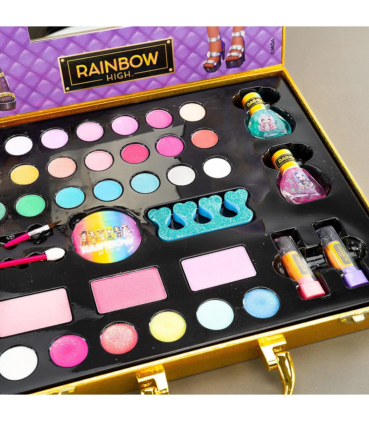 Precioso maletín de tus muñecas arco iris favoritas, ¡Rainbow High! Incluye un montón de maquillajes para pasar una tarde de beauty de lo más colorida. No recomendable para menores de 3 años, ya que contiene piezas pequeñas que podrían provocar asfixia en caso de ser ingeridas por el niño/a.