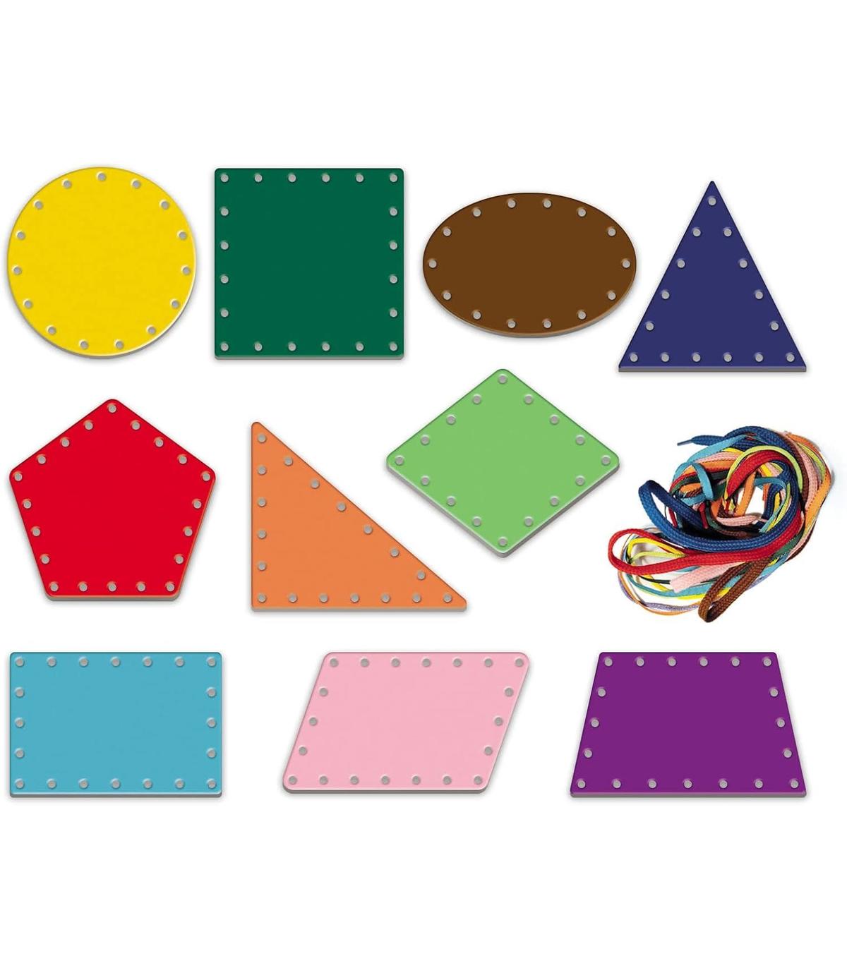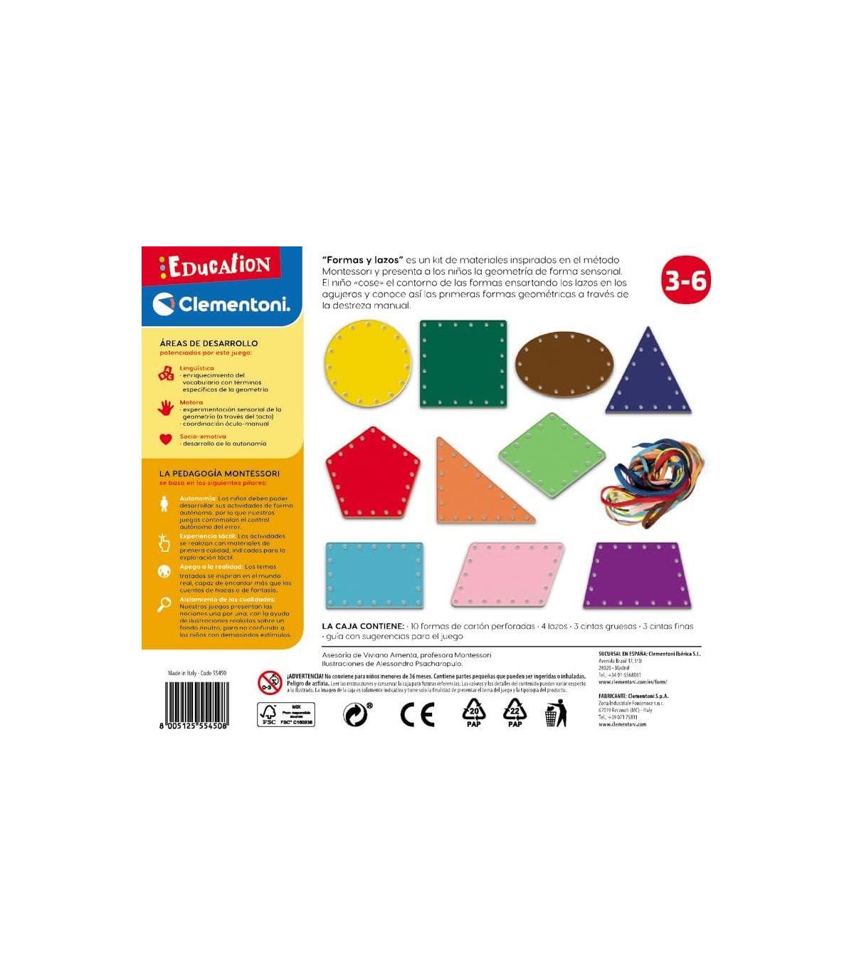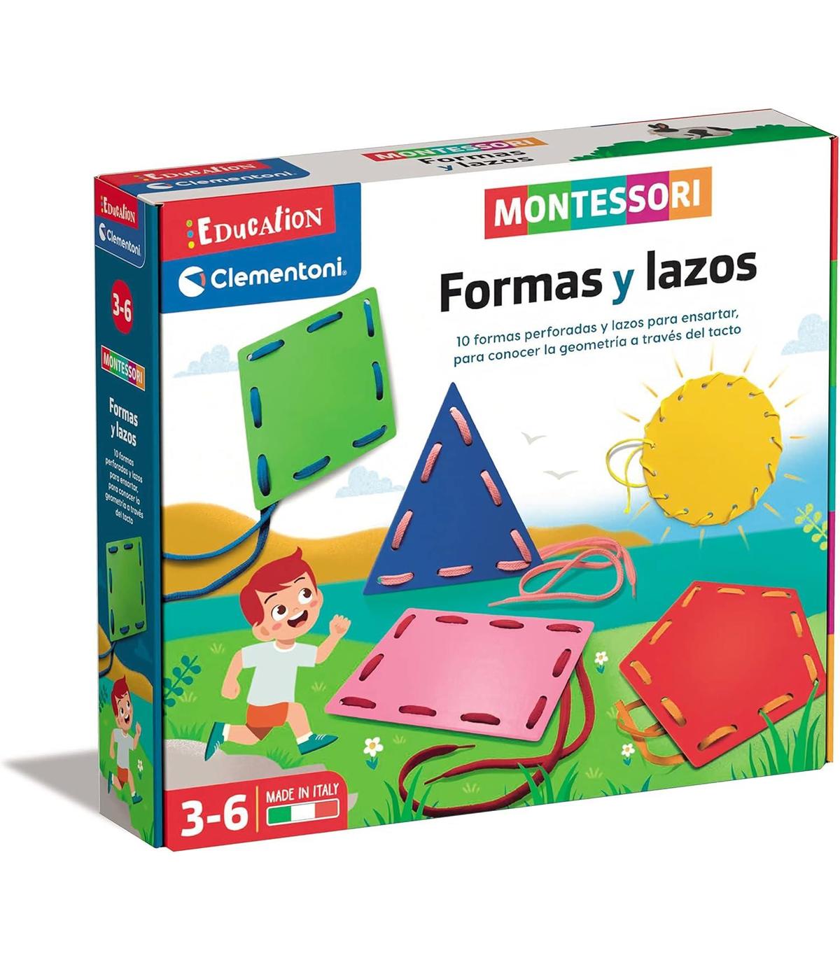 Montessori Formas Y Lazos Un juego que desarrolla la motricidad fina, organizado según niveles de dificultad, gracias a la presencia de lazos que van de los más gruesos a los más finos. 3 - 6 años Mediante el ejercicio de la destreza manual, el niño aprenderá naturalmente la geometría ensartando los lazos de colores en las formas de cartón con pequeños agujeros en el contorno Gracias a los movimientos de la mano que traza las formas, el niño memorizará los perímetros de las diferentes formas Un juego que desarrolla la motricidad fina, organizado según niveles de dificultad, gracias a la presencia de lazos que van de los gruesos a los finos Un juego inspirado en el método Montessori, para aprender de forma natural y sin forzar Juguete en español