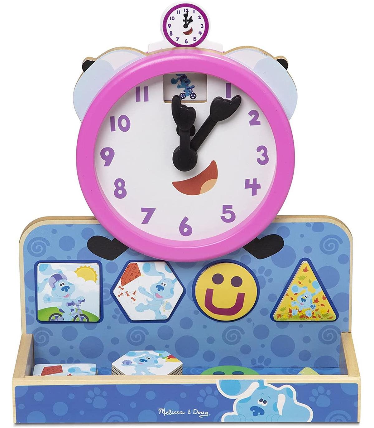 Incluye 5 fichas de reloj de doble lado, 25 imanes de madera con formas, y reloj de madera con manecillas y soporte de almacenamiento integrado