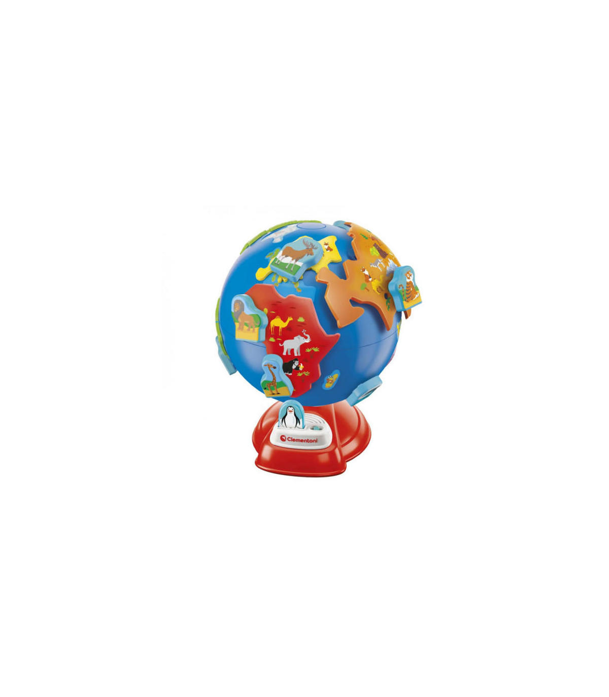 Edad: 3-5 años. Un gran globo electronico, hecho de plastico recliclado: con continentes y animales para montar y aprender muchas curiosidades sobre ellos y su habitat. El globo tambien ofrece divertidos cuestionarios a los que el niño puede responder insertando el animal correcto en la base del globo. La diversion continua con el juego de ruta cooperativo, con el objetivo de viajar por todo el mundo antes de que llegue la tormenta, respondiendo los cuestionarios que ofrece el globo terraqueo.