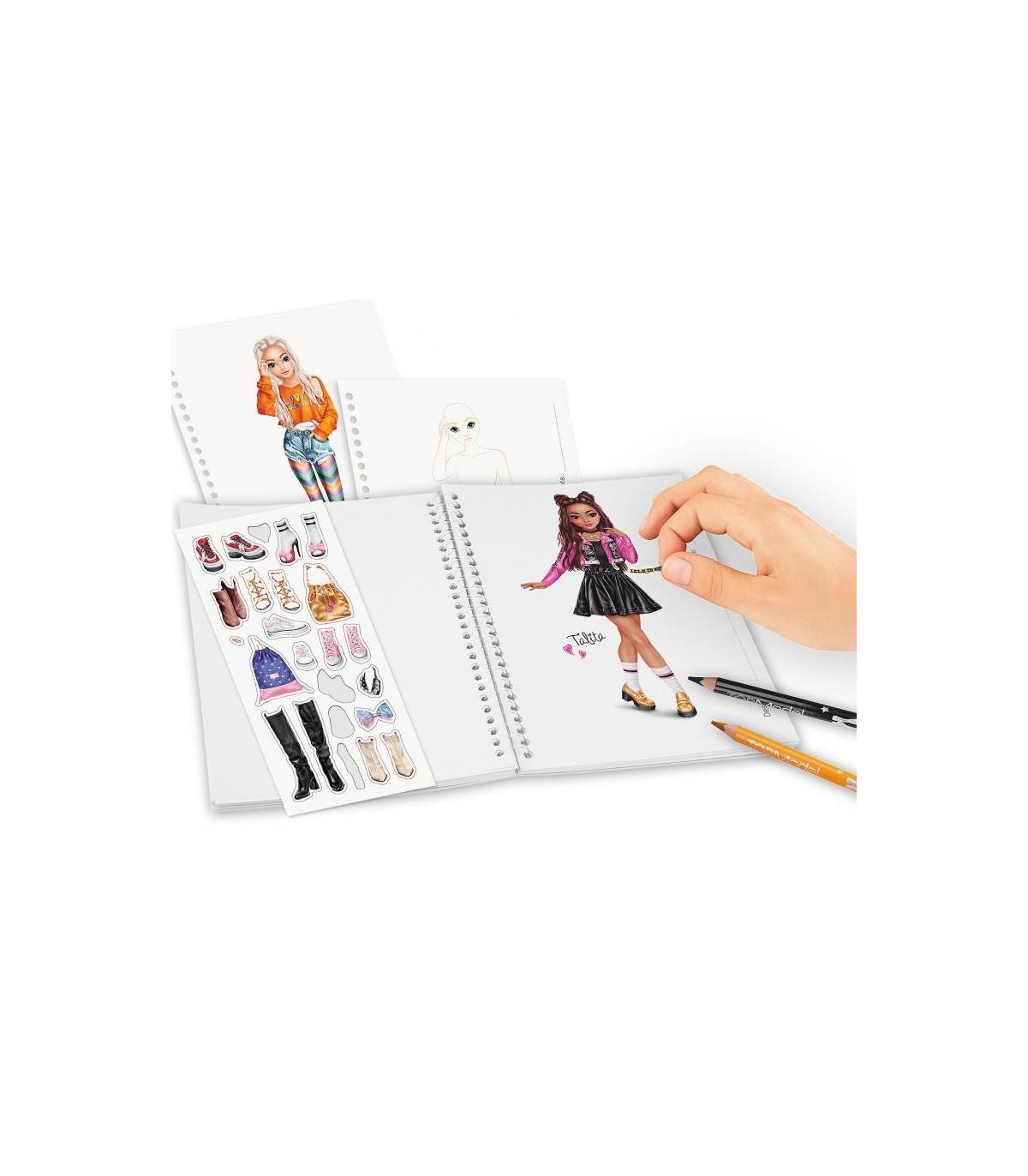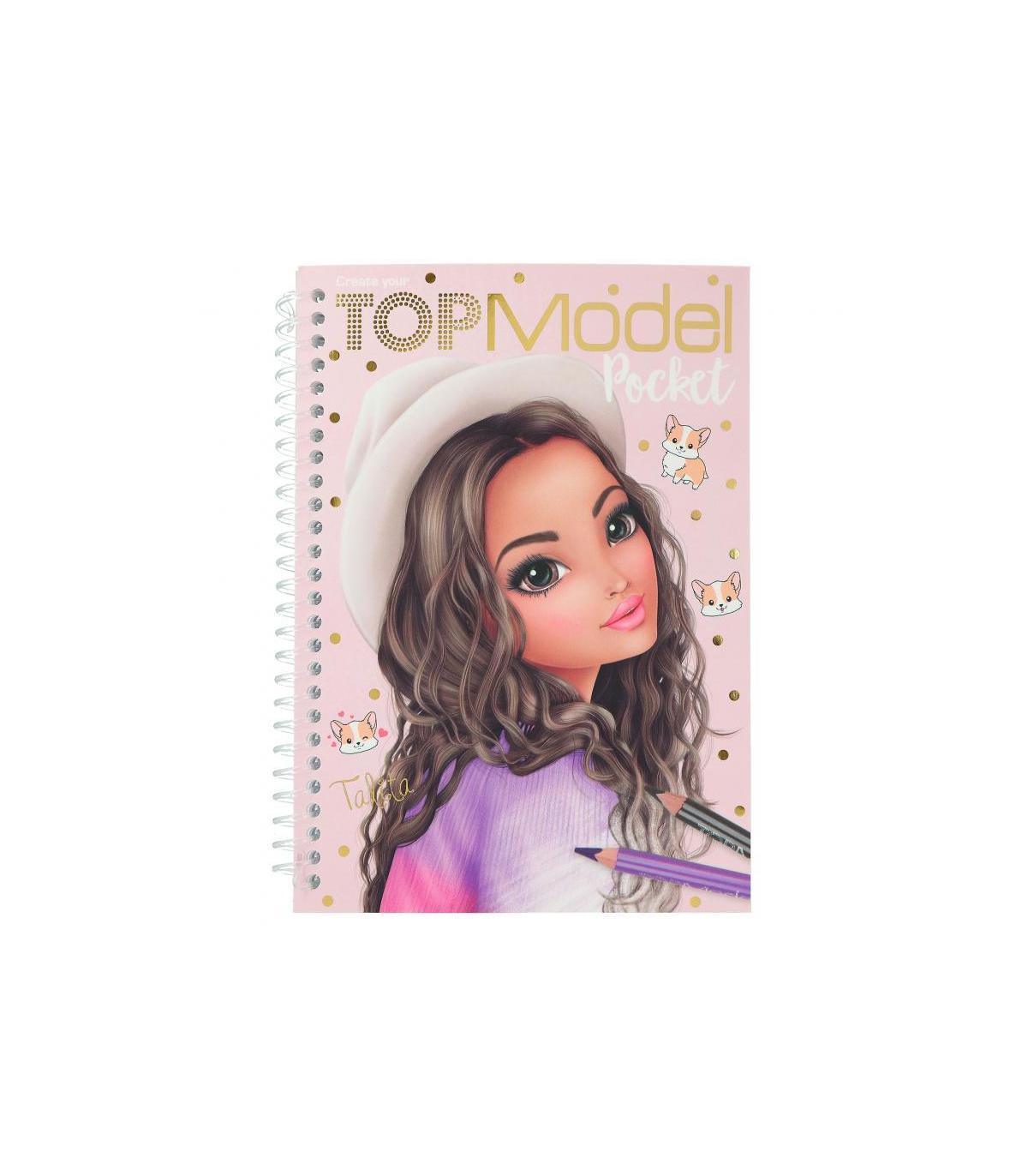 Cuaderno Colorear Topmodel Diseños chulísimos en un formato muy manejable. El cuaderno de dibujo TOPModel Pocket con tapa efecto purpurina brillante consta de 120 páginas con figurines de modelos para acabarlas de diseñar y colorear, utilizando fantasía a raudales. También incluye 1 hoja de pegatinas con complementos a la última.