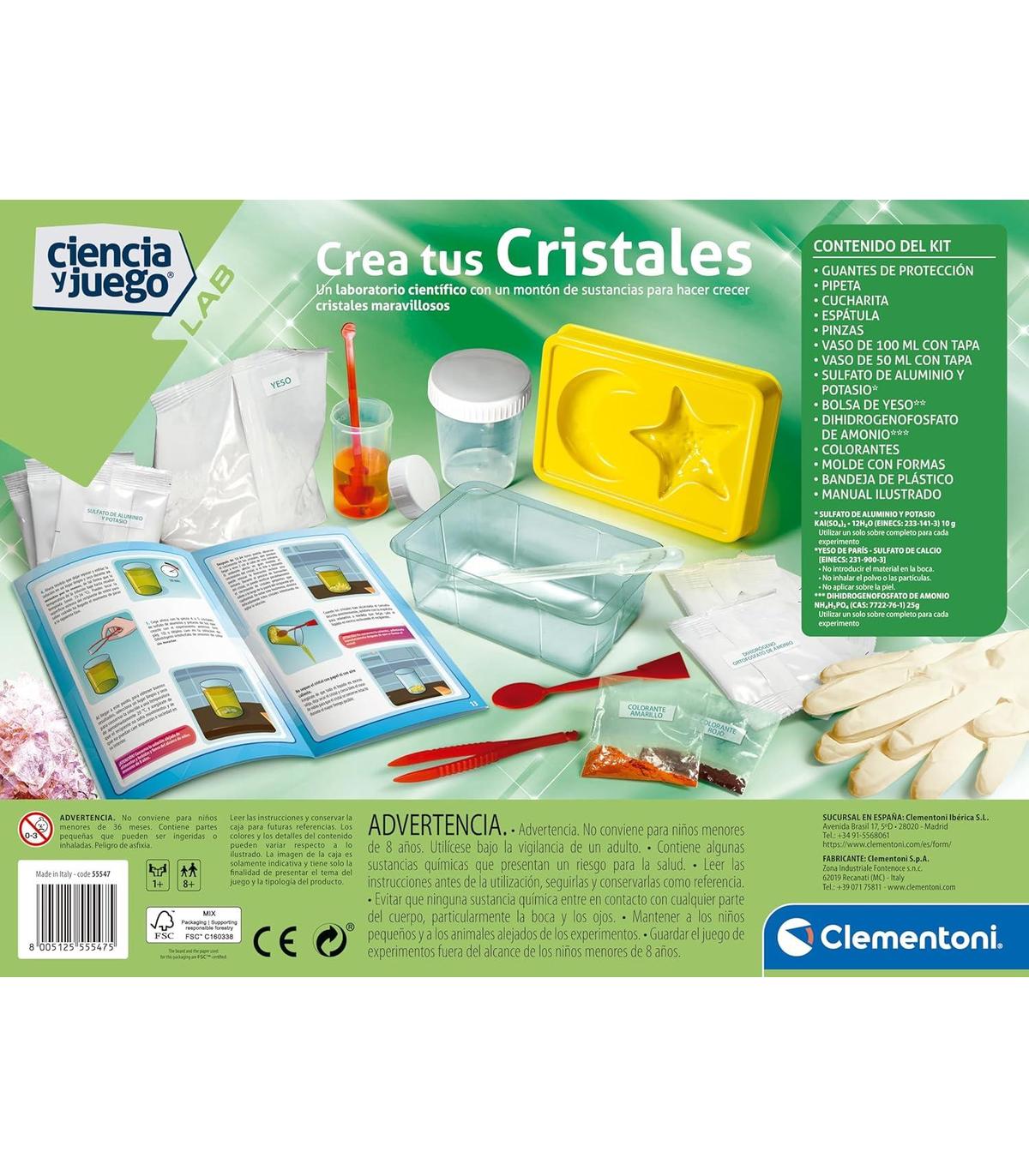 Crea Tus Cristales Un laboratorio con todo lo necesario para obtener cristales blancos y de colores; un kit cientítico para hacer experimentos de forma segura y divertida Un kit para descubrir las reacciones químicas de las sales y crear una gran variedad; haz tus propios cristales a tu gusto El completo manual ilustrado acompaña al niño a través de las diferentes etapas de los experimentos, para que pueda jugar con total seguridad y diversión Los más pequeños podrán crear distintos tipos de cristales, mientras aprenden tanto conocimientos de geología como otros relacionados con las reacciones químicas que van experimentando Un juego pensado para introducir a los niños en la ciencia de forma fácil y divertida; para niños y niñas a partir de 8 años