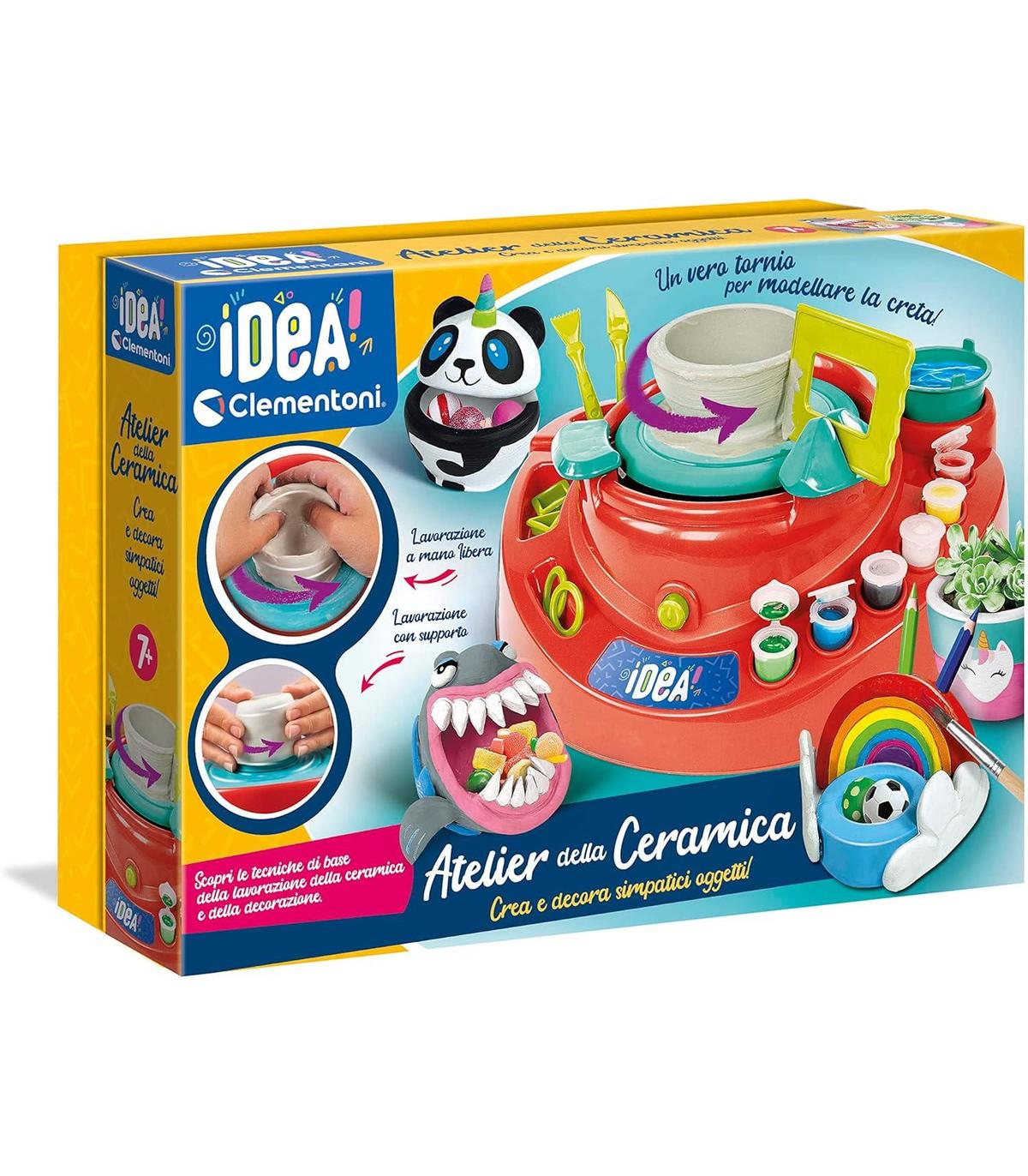 CONTENIDO DEL POTTERY LAB: torno eléctrico con tablero giratorio, plantillas de plástico, herramientas, barra de arcilla de 500 g (se puede comprar en el sitio web Clementoni), pincel, témperas y manual ilustrado