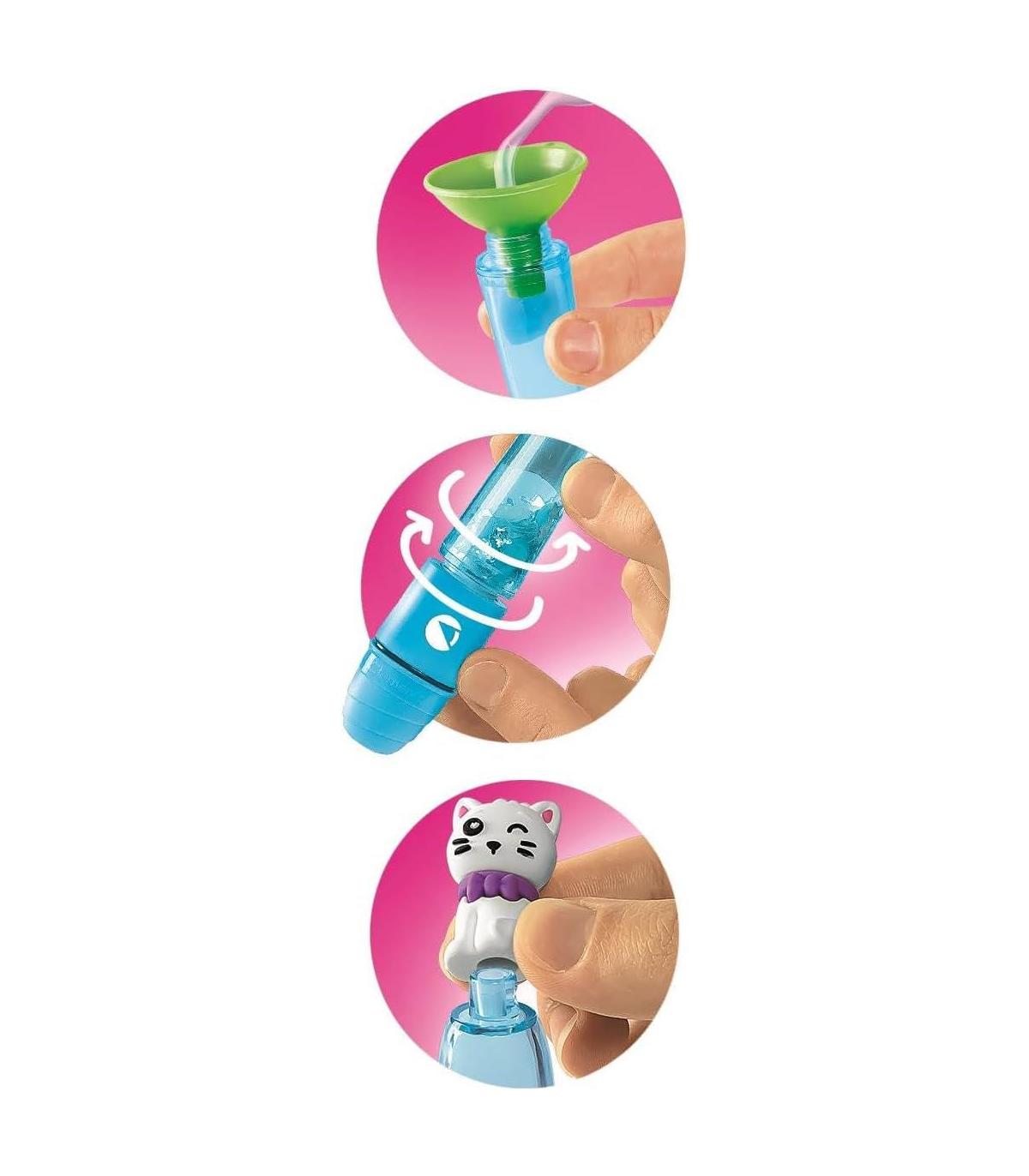 Lo que contiene: juego ideado, diseñado y desarrollado en Italia, con 3 subrayadores para decorar con tapones, tapas, tintas, decoraciones iridiscentes, cuentas, cordones elásticos y 3 personajes diferentes, con manual para guiar en la composición