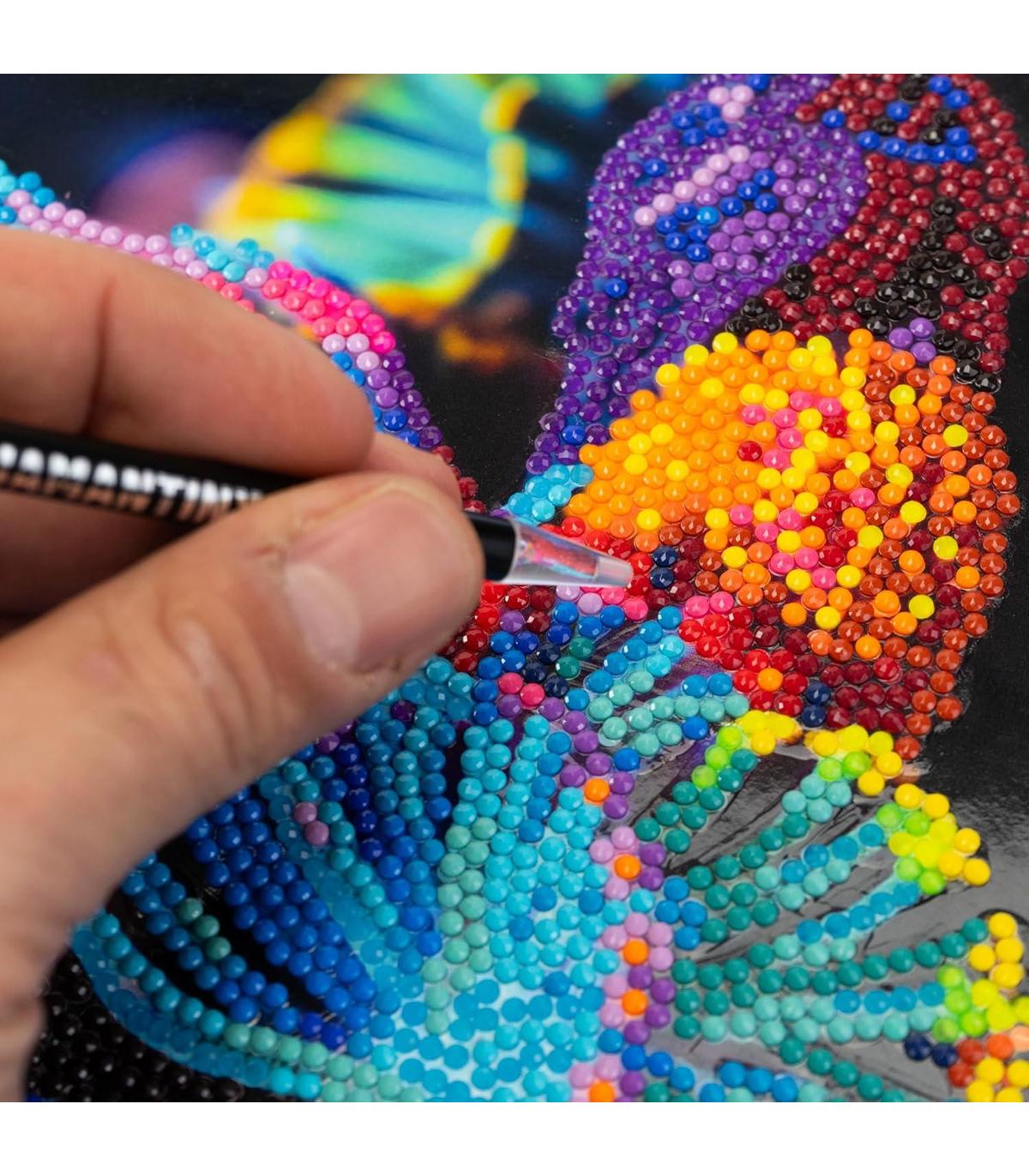 Contenido: el juego contiene 1 cuadro de 21 x 29,5 cm con base adhesiva y guía de color, 3000+ cristales de colores, 1 bandeja recogedor, 1 bolígrafo con el que aplicarlos y 1 cuadrado de cera.