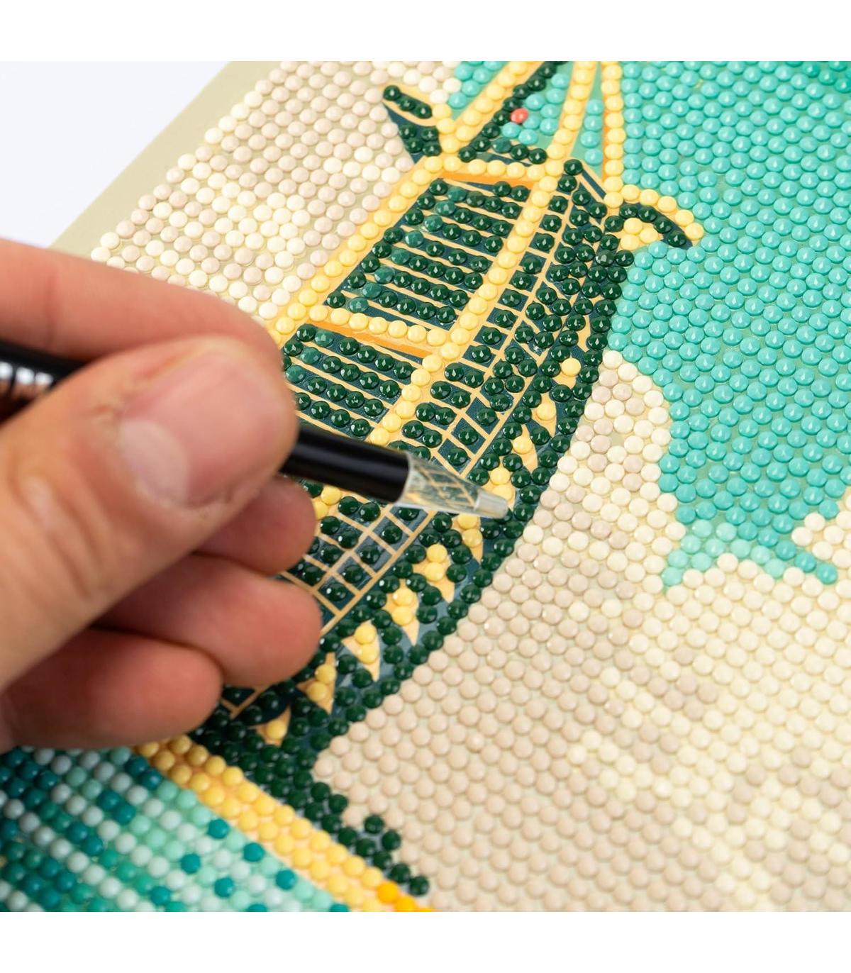 Contenido: el juego contiene 1 cuadro de 21 x 29,5 cm con base adhesiva y guía de color, 3000+ cristales de colores, 1 bandeja recogedor, 1 bolígrafo con el que aplicarlos y 1 cuadrado de cera.