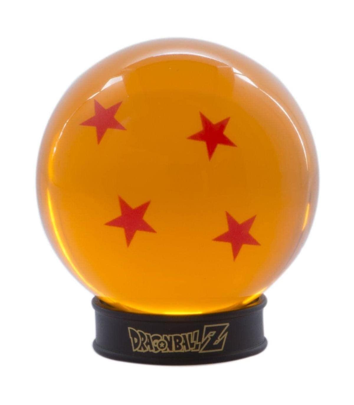 La gran bola de dragón Nº4 de la serie anime Dragon Ball ahora en versión réplica de gran tamaño. Está realizada en PVC muy transparente y de gran peso, y sus cuatro estrellas se ven perfectamente en su interior brillantes. La Bola de Dragón viene con una peana para ser expuesta, mide 7,5 cm de diámetro y es de un color naranja llamativo. Un gran regalo y original para los fans de la serie de manga y anime Dragon Ball. No recomendable para menores de 3 años, ya que contiene piezas pequeñas que podrían provocar asfixia en caso de ser ingeridas por el niño/a.