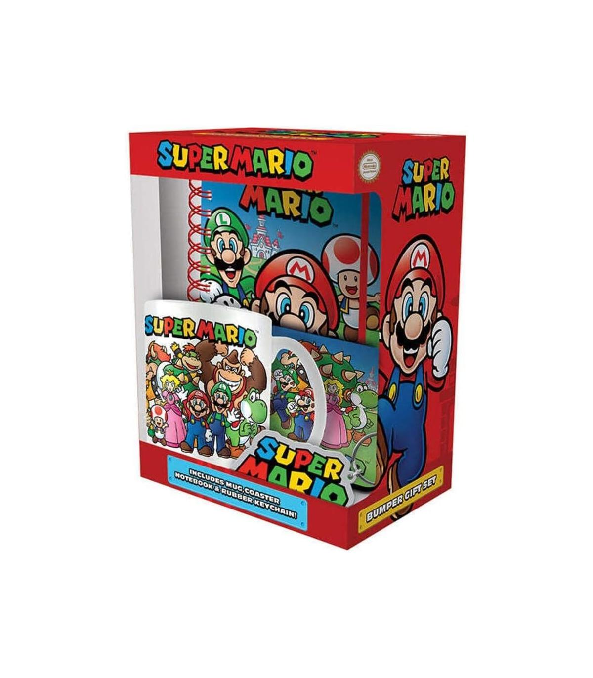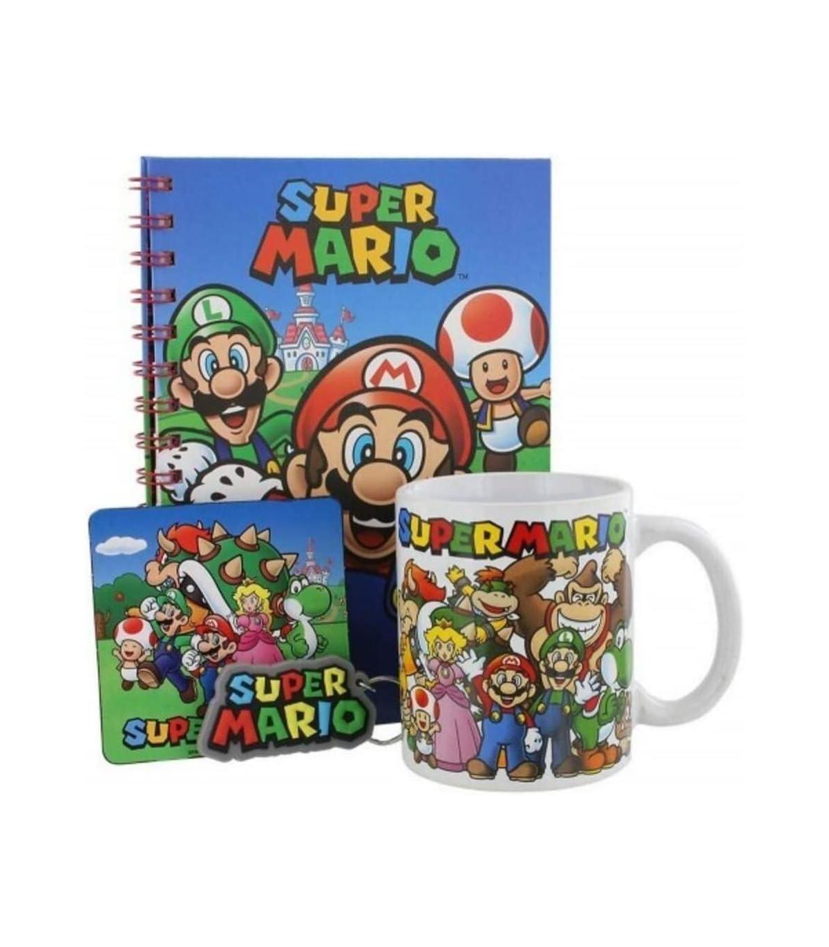 Los artículos de esta caja de regalo están fabricados con licencia oficial "Super Mario". El paquete incluye: 1 taza, 1 cuaderno y 1 llavero, 1 posavasos. Ecellenta idea de regalo. Objetos para regalar o coleccionar. Cultura geek/retro.