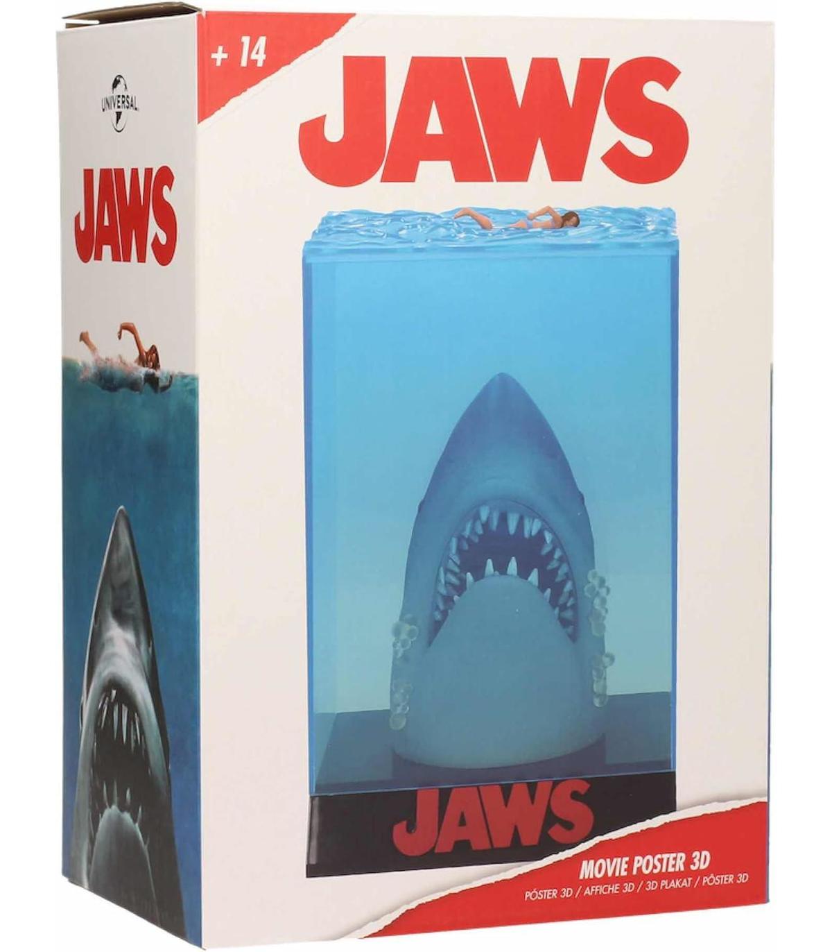 CON PODIO Y CAJA DE EXPOSICIÓN. Una figura de pvc que mide 17 cm de ancho, 10 cm de largo y 27 cm de alto. Está posada en un podio grabado con el nombre del film: "JAWS". Además, la caja de acrílico transparente permite exponerla tanto dentro como fuera de ella.