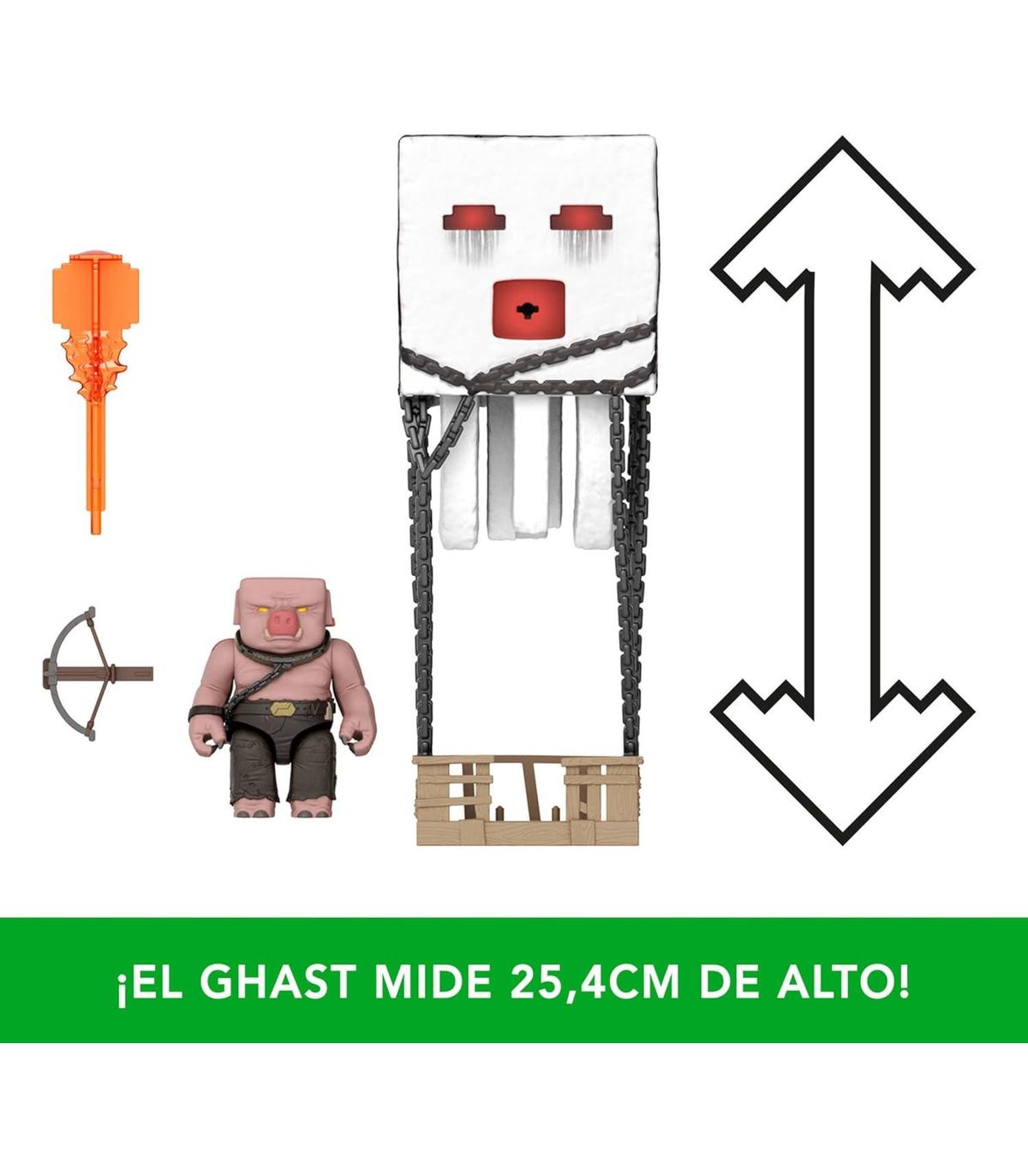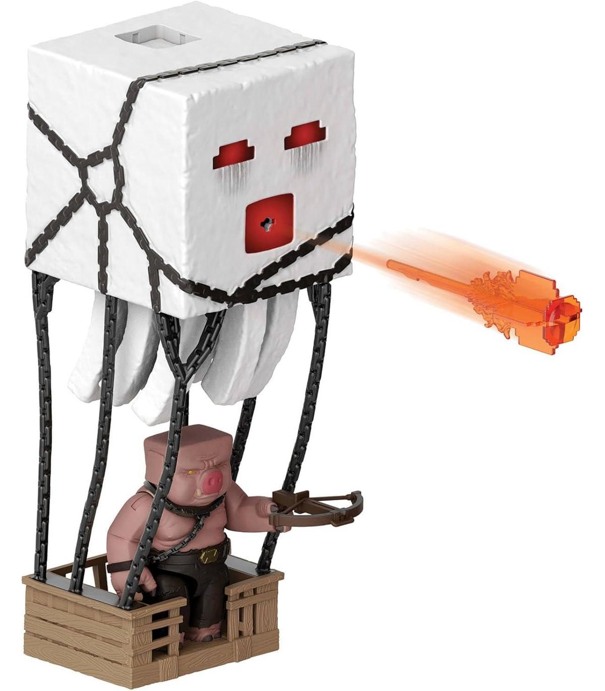Este juguete no es solo para admirar, ¡es para jugar! Al apretar la parte superior de la figura, se activan sonidos de batalla y silbidos, iluminando el Ghast y disparando un proyectil, recreando emocionantes escenas de combate de la película. La figura viene con un guerrero piglin encadenado al Ghast, utilizado como vehículo de ataque, lo que añade un toque dinámico y auténtico al juego.