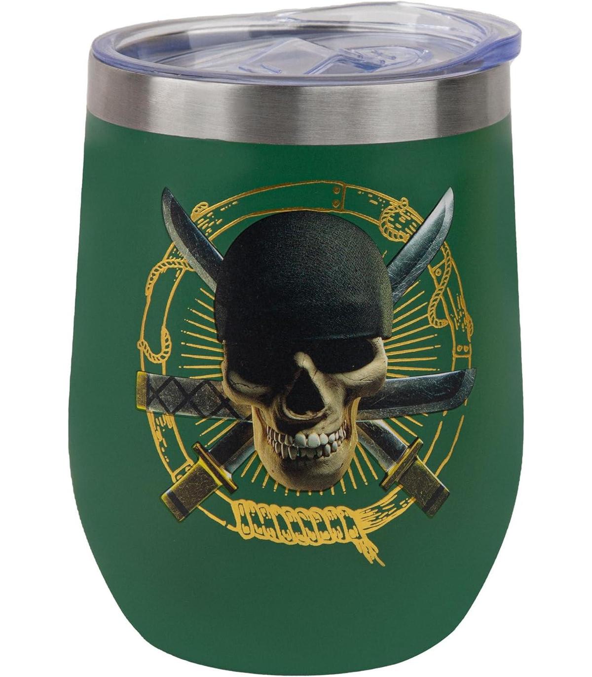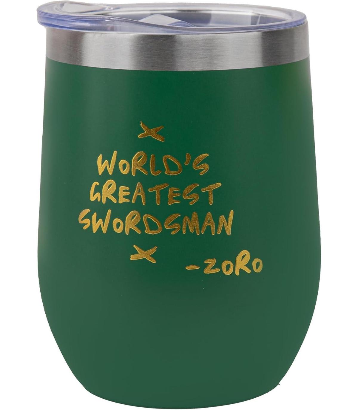 Diseño original: diseñada con un vibrante exterior verde brillante, esta taza de viaje cuenta con el icónico roger alegre de Zoro y la frase "World's Greatest Swordsman" en la parte posterior.
