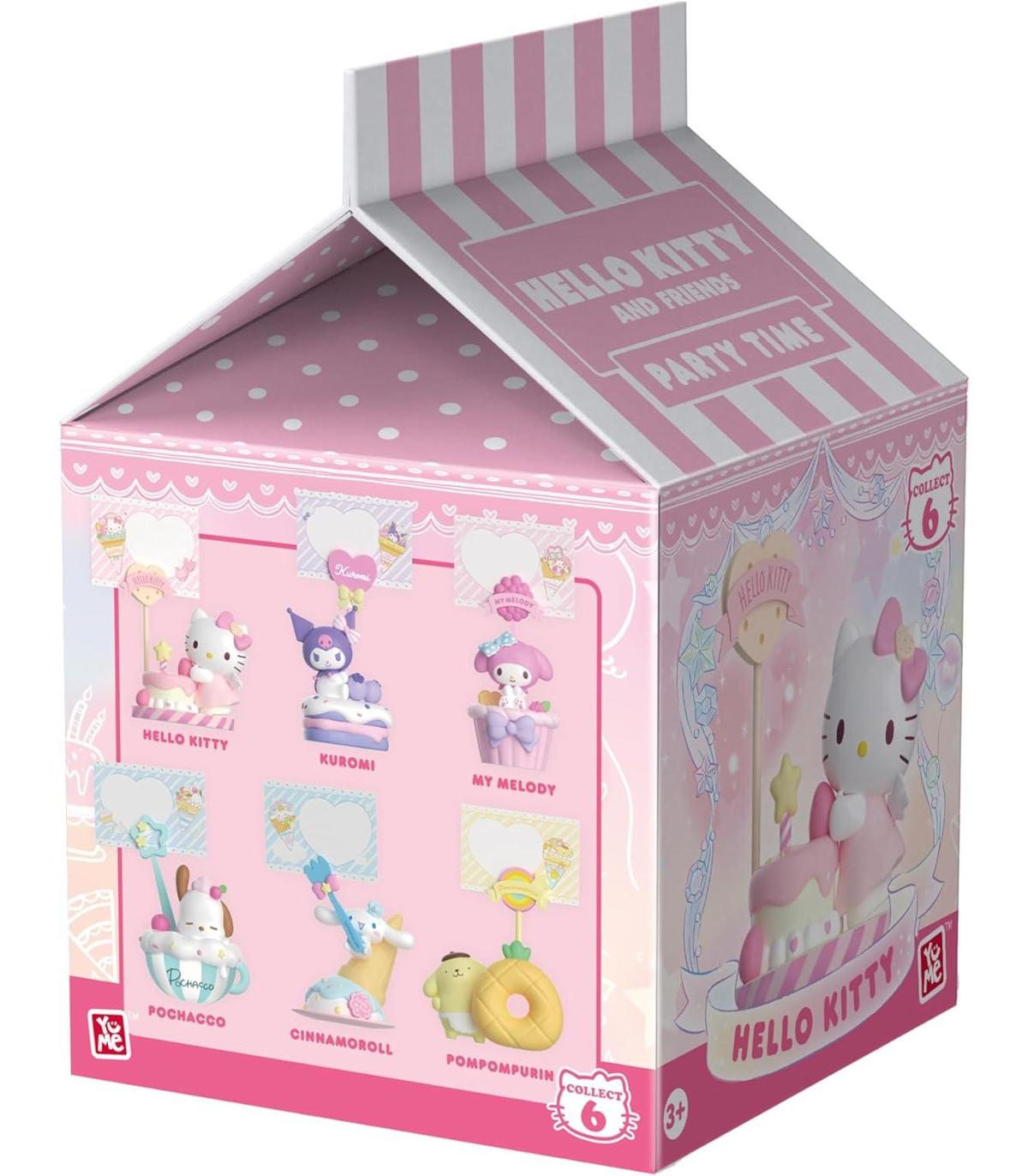 Hello Kitty y sus queridos amigos, cada uno diseñado en posturas lindas y divertidas que reflejan un ambiente alegre de fiesta.
