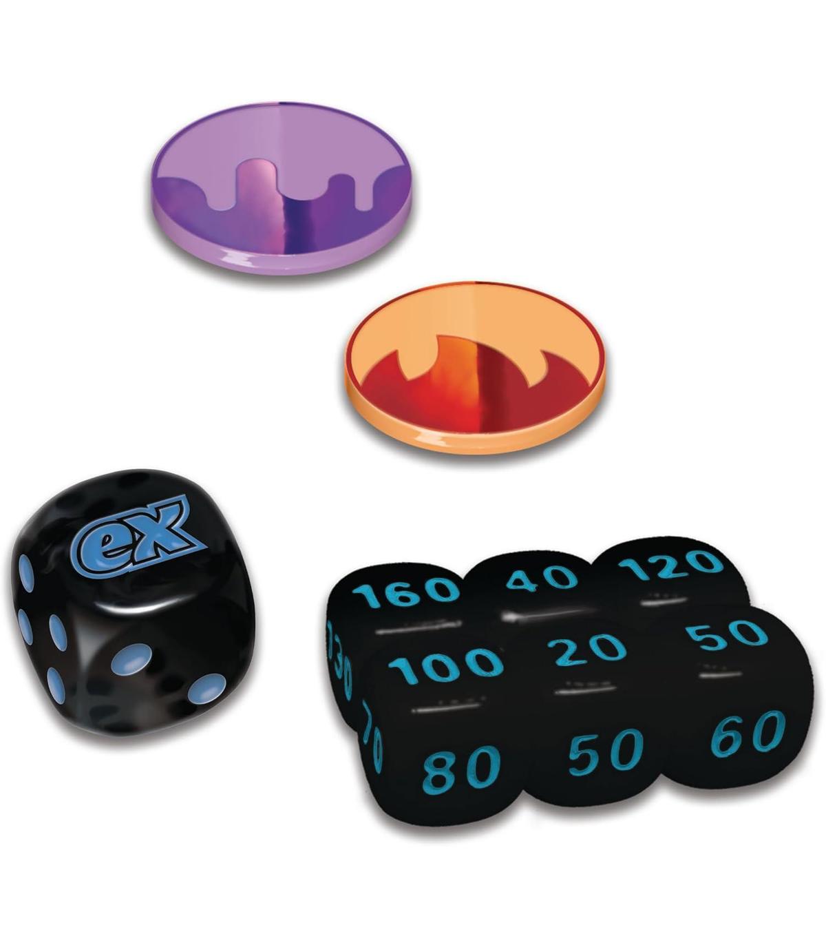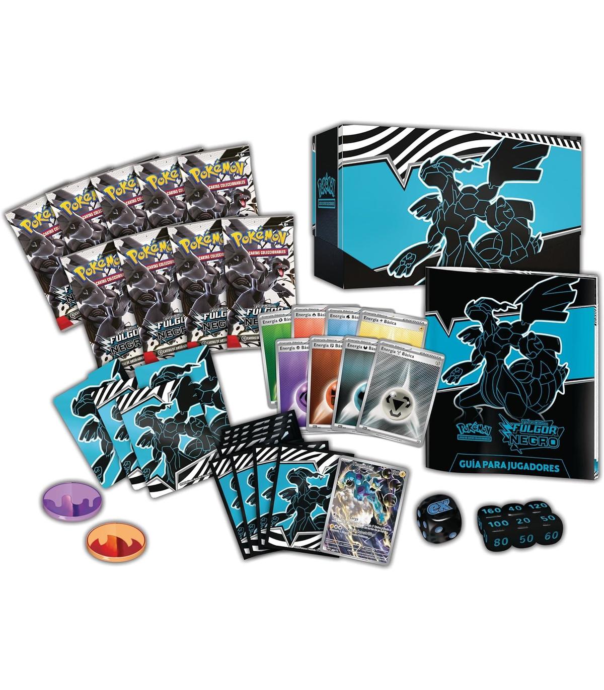 Además, esta caja contiene 45 cartas de Energía de JCC Pokémon, 6 dados a modo de contadores de daño, 1 dado para lanzamiento de moneda válido para competiciones legales, 2 marcadores de condición de plástico y 1 guía para jugadores de la expansión Escarlata y Púrpura-Fulgor Negro