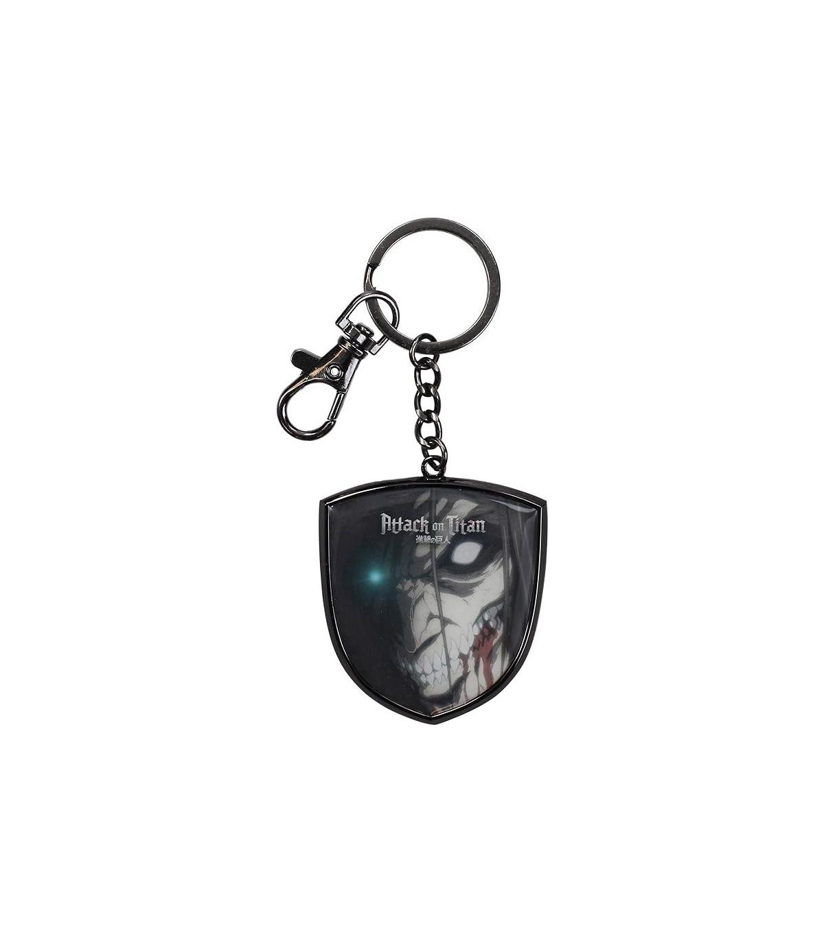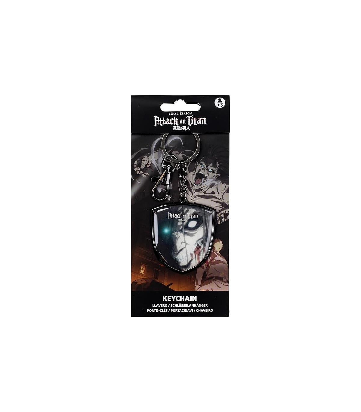 Captura la esencia de Attack on Titan con este llavero metálico que presenta una imagen impactante de Eren Jaeger con su forma de titán.