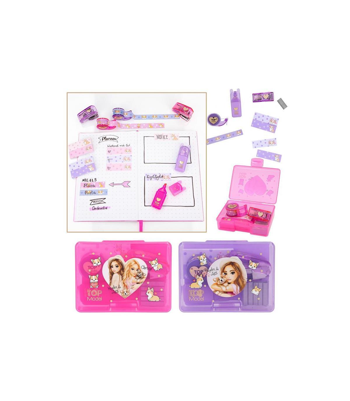 El monísimo perrito corgi está presente en todos los elementos del set de escritorio de la colección Corgi de TOPModel: en los dos blocs pequeños de hojas autoadhesivas, en el marcador con orejitas, en la cinta adhesiva decorada (4 m de cinta con portarrollos) e incluso también con un "guau- woof" en la grapadora (se incluyen grapas de repuesto de 10 mm de ancho por 5 mm de alto). Disponible en lila y rosa fucsia.