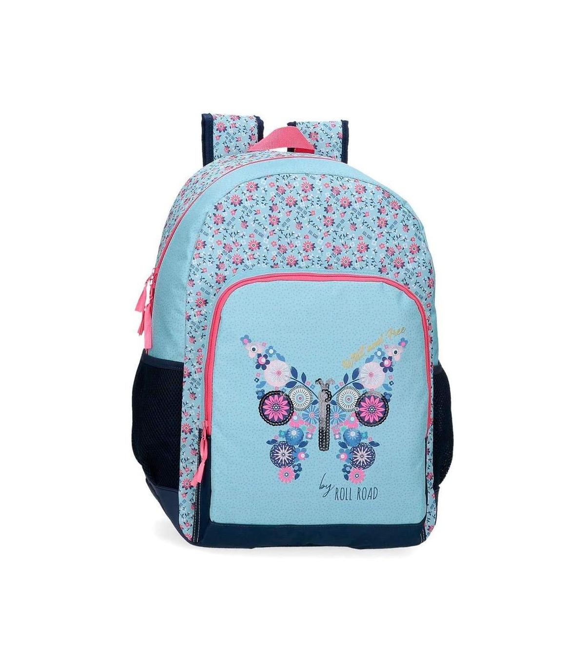 Compartimento principal ideal para llevar libros, libretas, carpetas y carpesanos de tamaño DIN A4; y bolsillo frontal para guardar los pequeños accesorios y el almuerzo.