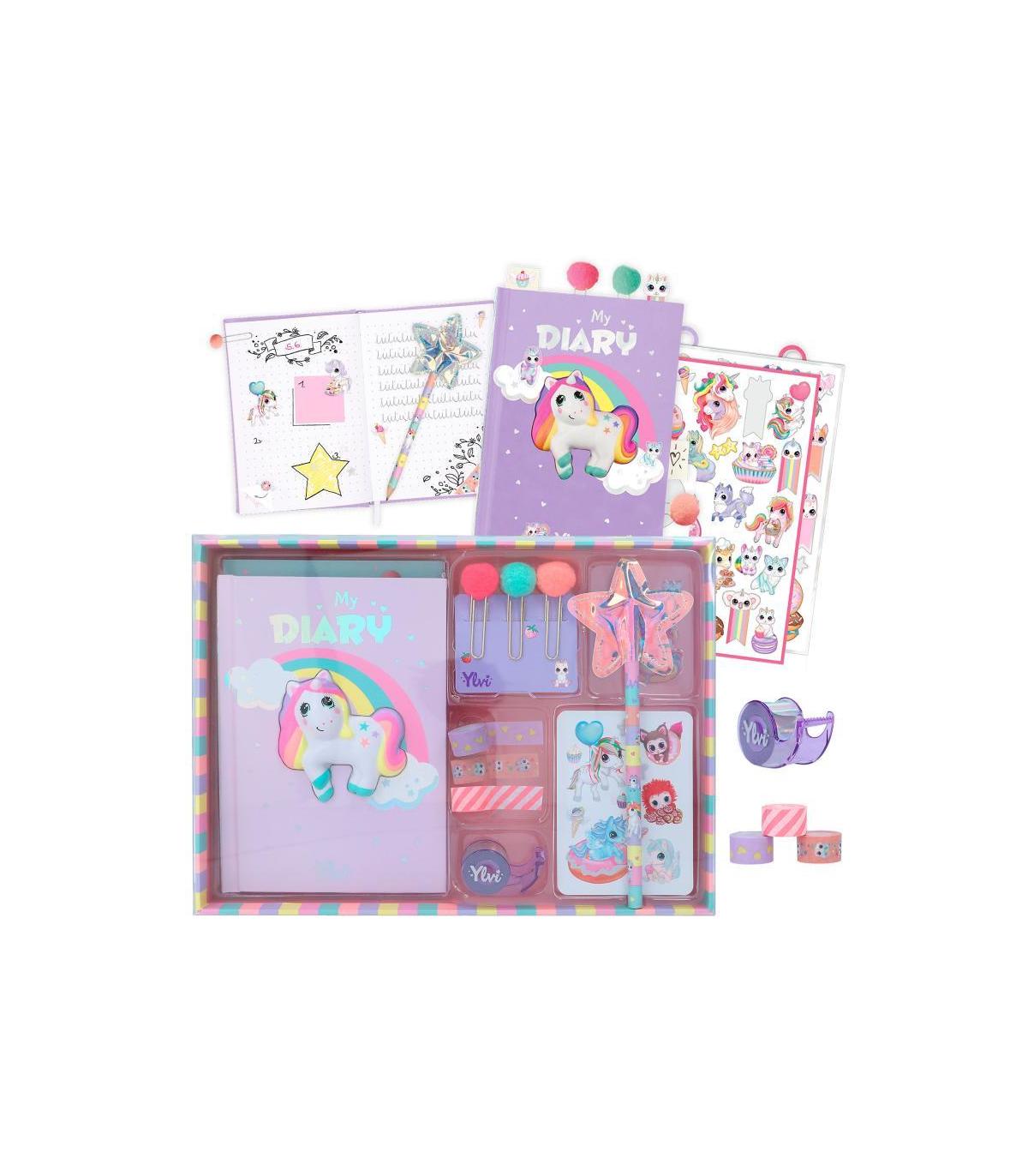 Un diario para crear y diseñar de forma personalizada. Este set de Ylvi está compuesto por un bloc de notas con pauta de puntos pequeños, 3 clips con pompones monísimos, 1 lápiz rematado con una estrella, 1 portarrollos y 4 cintas adhesivas decoradas y muchas pegatinas preciosas en torno al mundo mágico de la unicornio Naya. ¡Pero lo que más llama la atención es la figura en 2D de un unicornio en la portada!