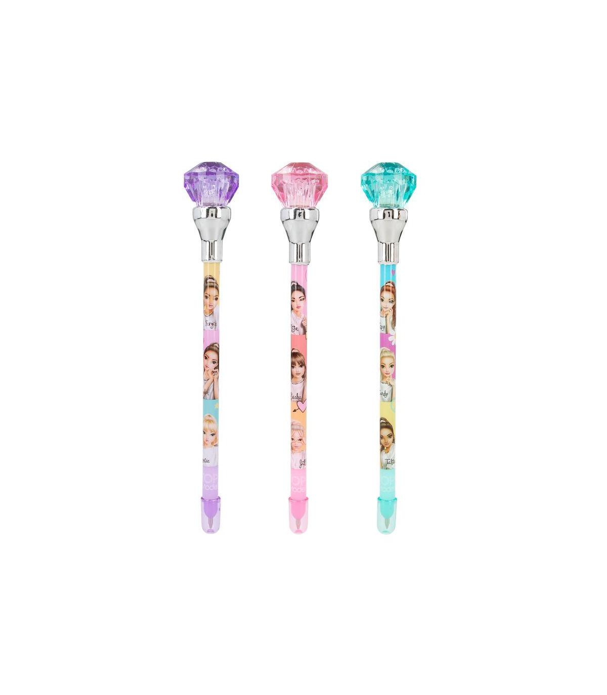 Para que escribir sea indescriptiblemente bello. Los diamantes que rematan los bolígrafos de TOPModel se iluminan con la presión que se ejerce al escribir. El cuerpo del bolígrafo está adornado con guapísimas modelos y el diamante puede ser turquesa, rosa o lila, a juego con el color principal del bolígrafo. Las pilas incluidas y la mina (tinta azul) no son recambiables.