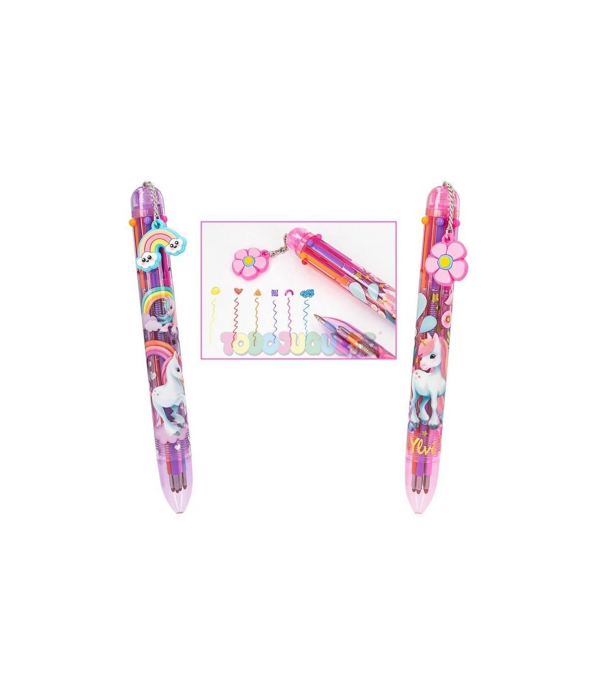 ¡1 bolígrafo, 6 colores! El bolígrafo de gel de Ylvi escribe con tinta roja, naranja, amarilla, lila, rosa o azul, según la mina que se escoja apretando el pulsador. Dos diseños: lila con el unicornio Naya y arcoíris como colgante y rosa fuerte con el unicornio Naya y flores como colgante. Las minas no son recambiables.
