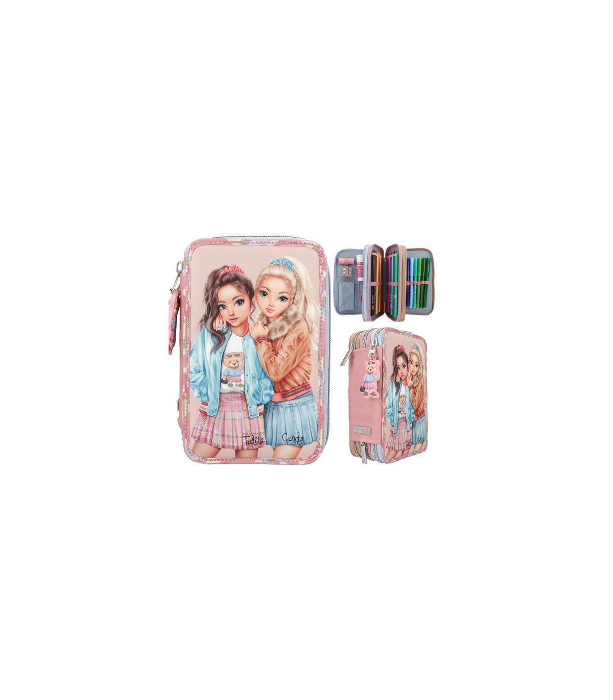 ¡Bienvenida al team Teddy! El estuche rosa empolvado de TOPModel lleva como motivo principal a dos modelos con mucho estilo, mientras que los bordes están adornados con preciosos detalles a cuadros y las cremalleras son de colores distintos. Monísimo: el estuche lleva un osito colgando. Los tres compartimentos separados vienen completamente llenos con 18 lápices de colores, 18 rotuladores, 2 lápices, goma de borrar, sacapuntas, regla, tijeras, pegamento en barra e incluso dispone de un pequeño bolsillo con cierre de velcro. Material: poliéster reciclado 100 por 100.