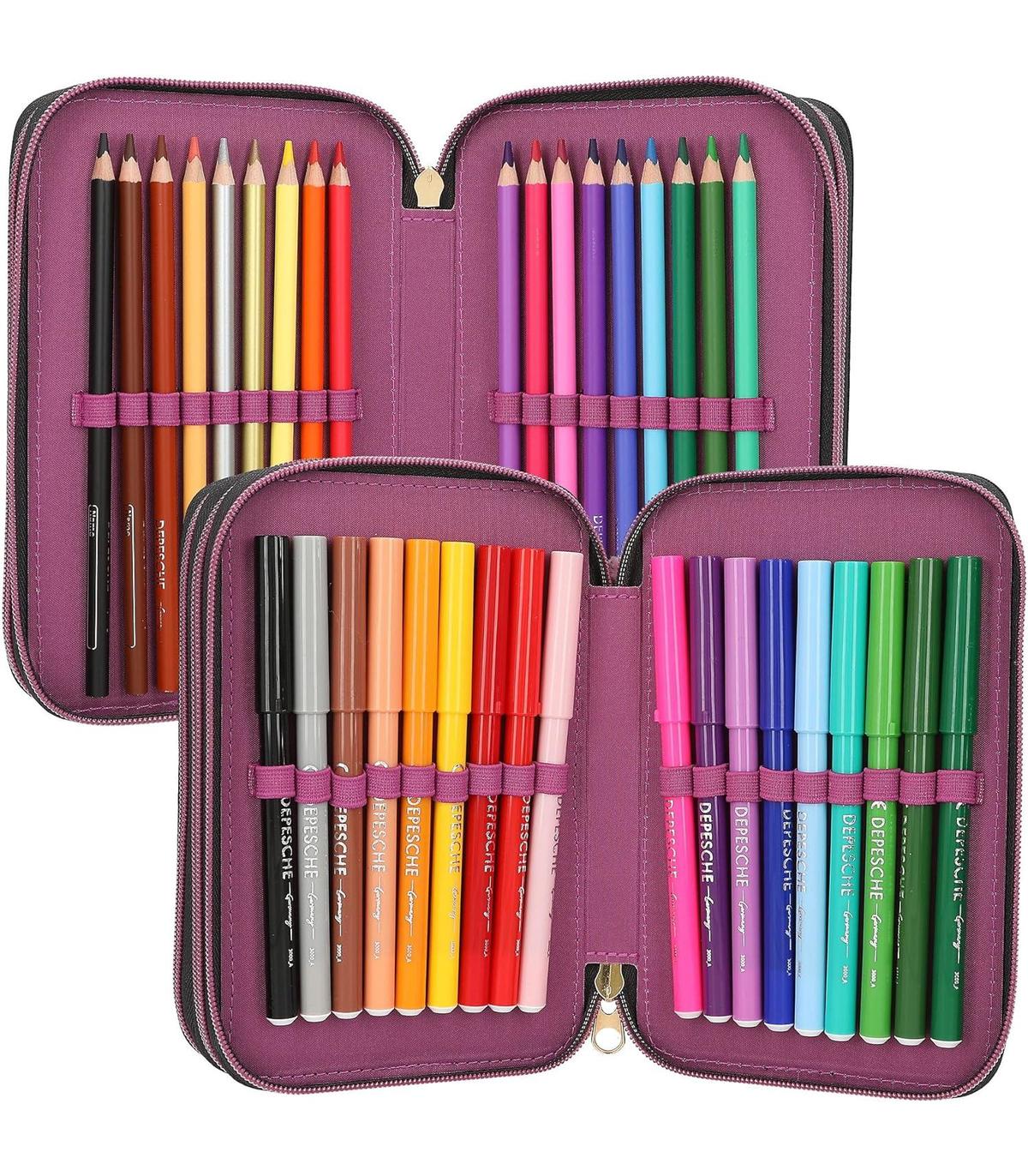 Contiene 18 lápices de colores y 18 rotuladores, 2 lápices, goma de borrar, sacapuntas, regla, tijeras y pegamento en barra.