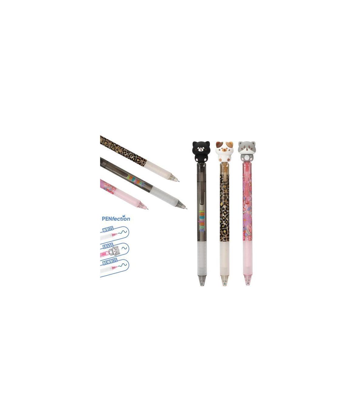 ¡Escribir, borrar, volver a escribir encima! No es problema con los bolígrafos de gel borrables PENfection. Los bolígrafos están rematados con un monísimo topper con forma de gatito que funciona como borrador (tinta azul termosensible que desaparece por calor o fricción). Las minas (fuerza 0,7 mm) no son recambiables. Disponibles tres diseños: topper de gato blanco-marrón y cuerpo del bolígrafo con animal print; topper de gato negro con cuerpo del bolígrafo negro transparente; topper de gato gris con cuerpo del bolígrafo rosa con adornos florales.