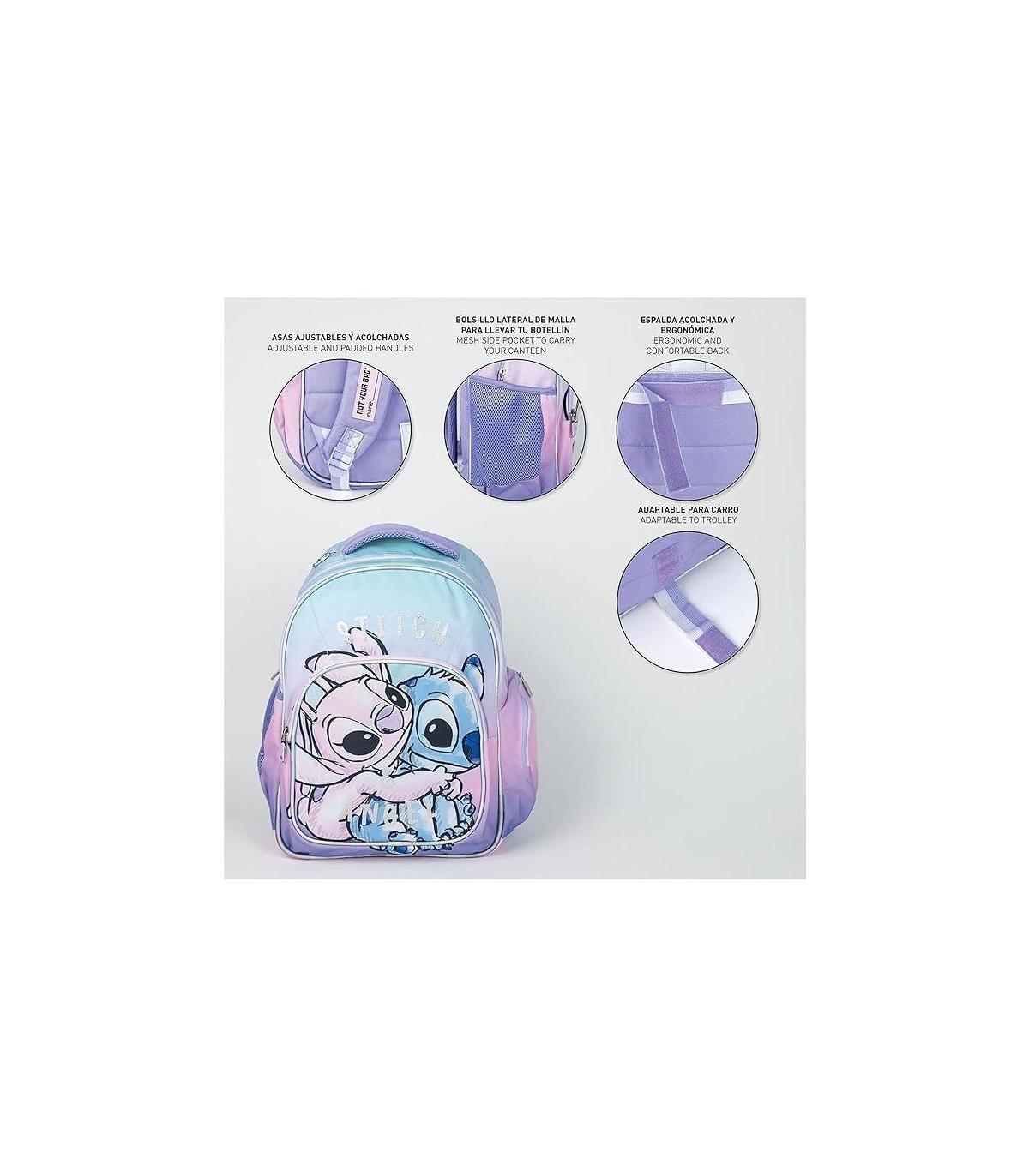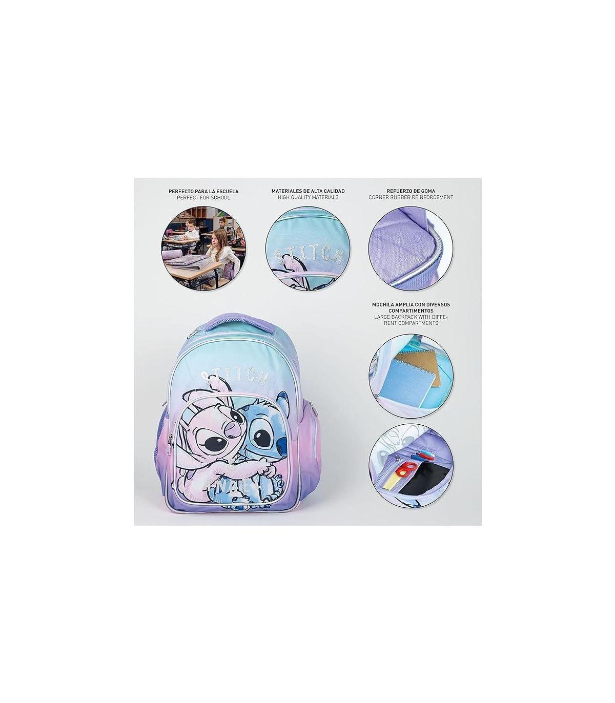 MOCHILA ESCOLAR DE STITCH: Hemos creado las mochilas con 100% poliéster y varios compartimentos para que a tus peques no les falte de nada en el cole. Gracias a su bolsillo lateral, podrán guardar su botella de agua.