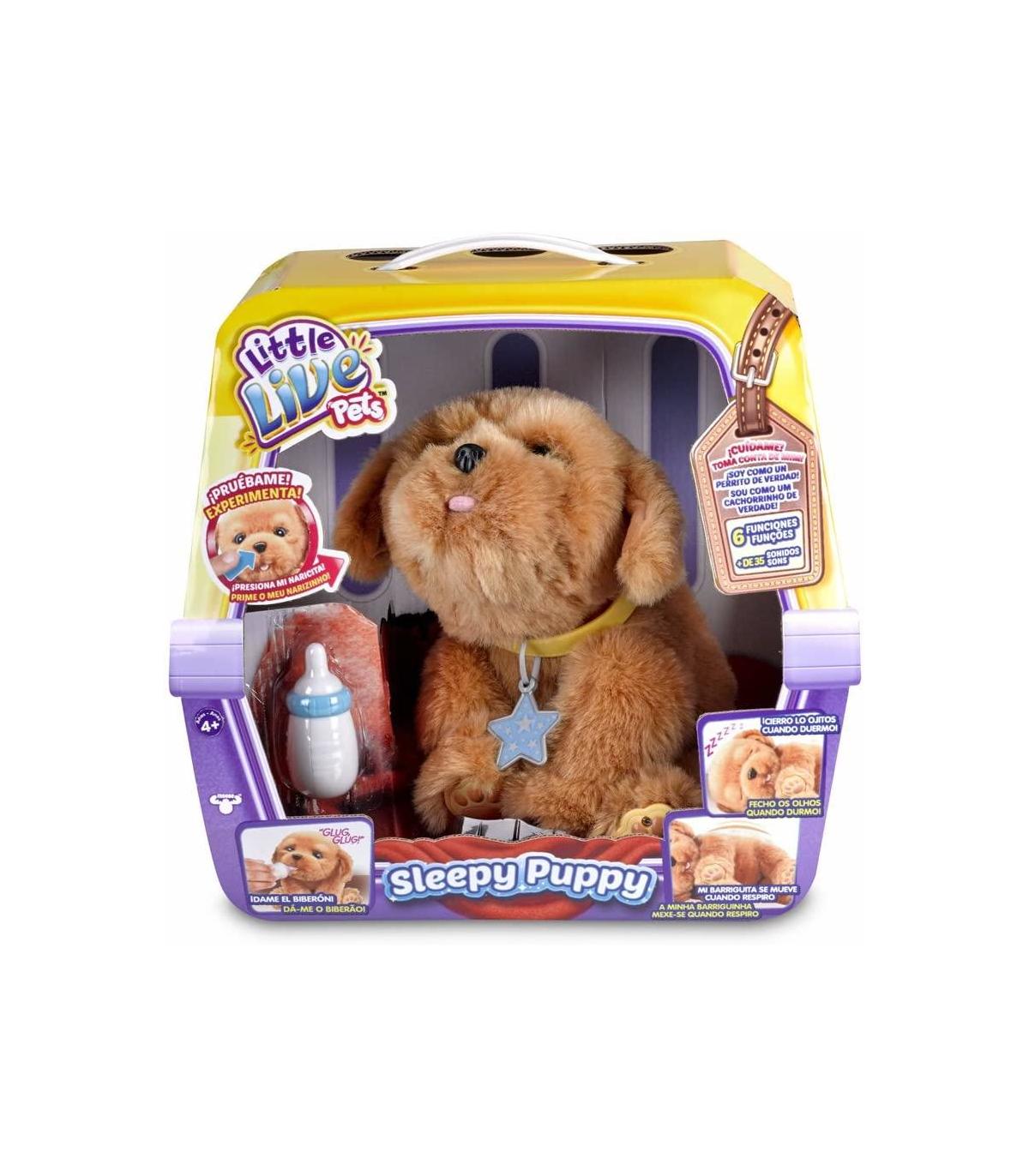 Little Live Pets Sleepy Puppy El perrito de Little Live Pets hace soniditos y se mueve como un perrito de verdad. Abre y cierra los ojos, si lo acaricias se pone contento, su barriguita se mueve al respirar y si le das un besito, ¡Te lo devolverá!