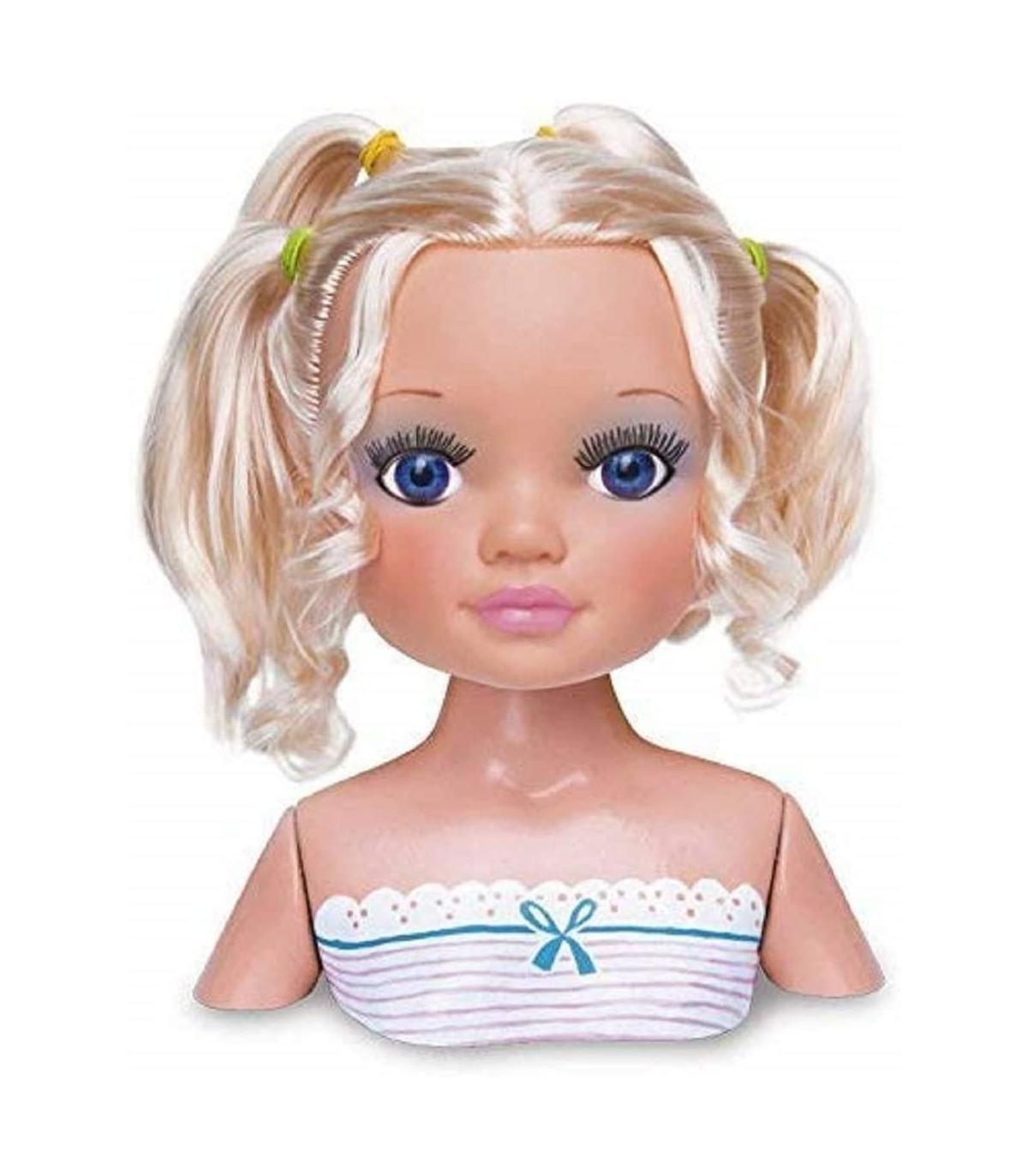 Incluye busto de peluquería y accesorios: peines, brochas para maquillar, pestañaz postizas, pegatinas, purpurina, gomas de pelo, pintalabios…