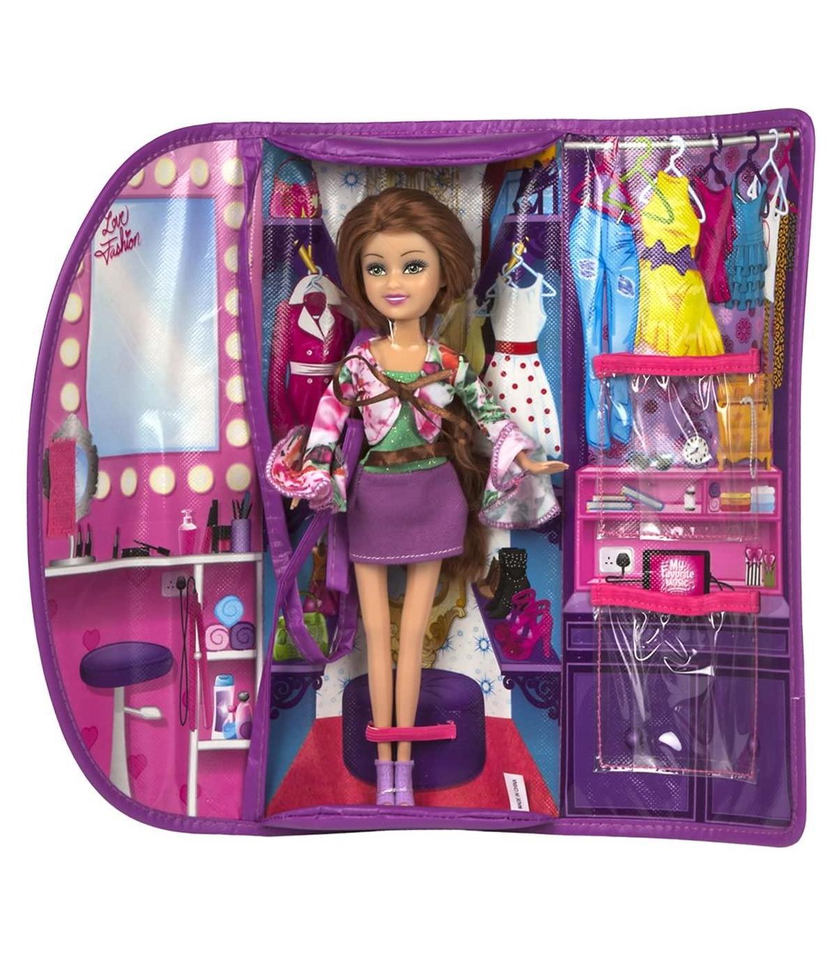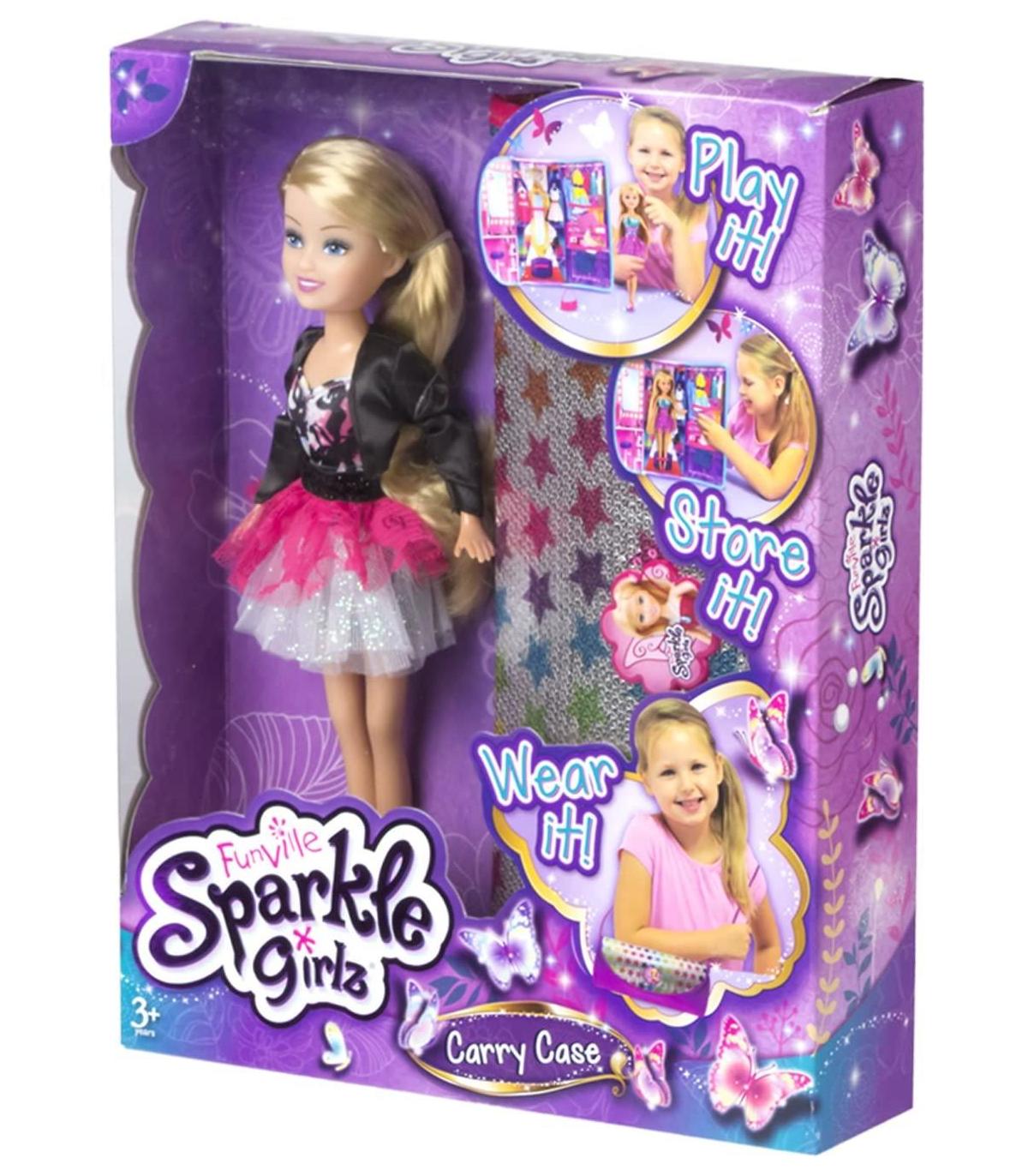 Muñeca Maniquí Sparkle Se presenta dentro de un estuche que también se puede lucir como bolso con lentejuelas El interior del estuche está decorado imitando a una tienda de moda 28 cm
