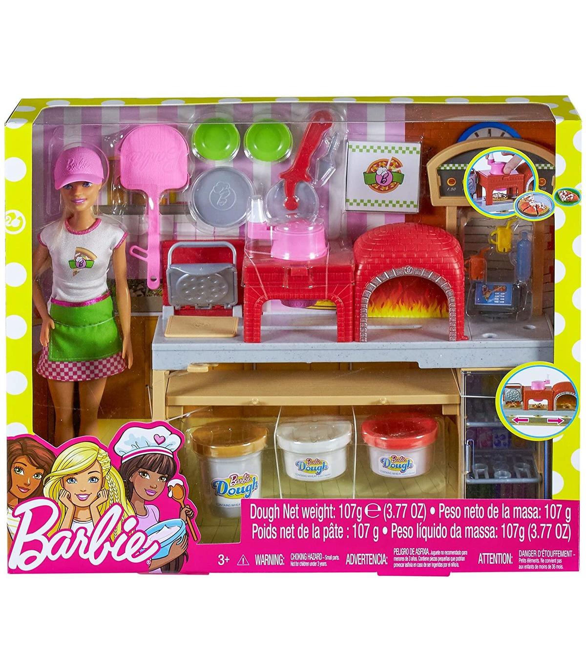 Cocina un montón de diversión con Barbie y su pizzería, que incluye un horno con funciones creativas y todos los ingredientes necesarios para preparar, «cocinar» y servir pizza, ¡como masa de tres colores distintos!