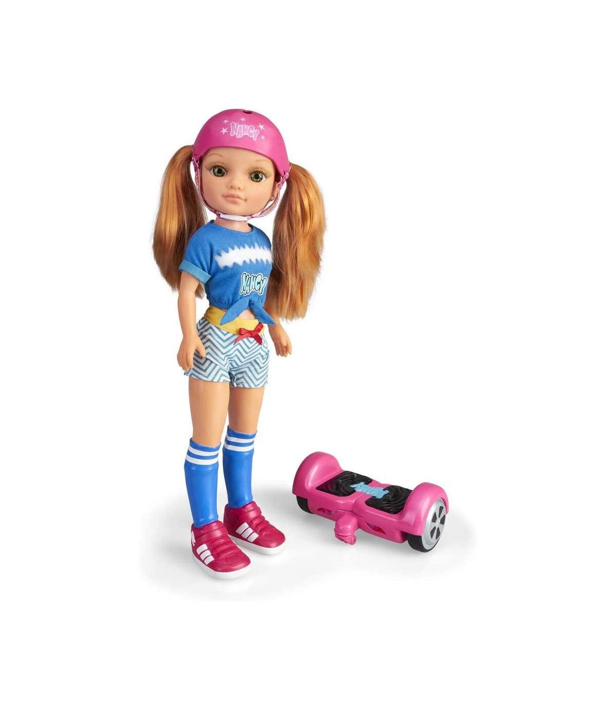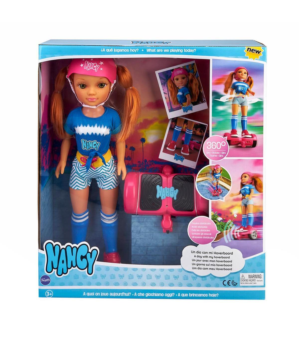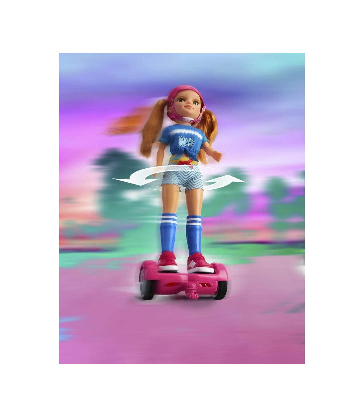Nancy , Un día con mi Hoverboard, es la Nancy más cool que has podido imaginar. Tiene un hoverboard rosa que funciona de verdad. Hacia delante y hacia atrás y, lo más alucinante, es que puede dar giros 360º y sistema anti-obstáculos. Nancy de pelo pelirrojo lleva un look precioso con casco y zapatillas a juego.