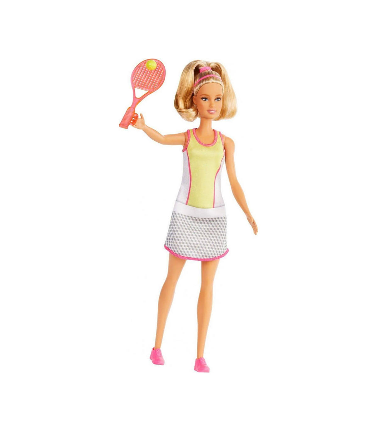 Barbie jugadora de tenis rubia lleva un elegante conjunto con una raya central amarilla y una falda con ribetes rosas. La muñeca Barbie jugadora de tenis está lista para jugar el partido con su raqueta y pelota de tenis ¡Colecciona las Barbie Yo quiero Ser! Barbie jugadora de tenis rubia lleva un elegante conjunto con una raya central amarilla y una falda con ribetes rosas. La muñeca Barbie jugadora de tenis está lista para jugar el partido con su raqueta y pelota de tenis ¡Colecciona las Barbie Yo quiero Ser! Medida aproximada Barbie: 30 cm.