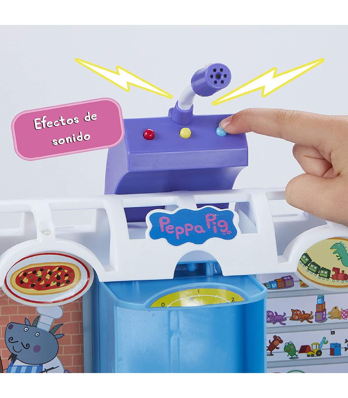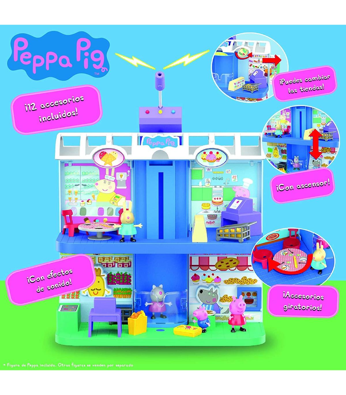¡Bienvenidos al centro comercial de Peppa Pig! Prueba su micrófono de verdad, ¡y reproduce música y muchos sonidos diferentes! Este divertido playset tiene cuatro zonas de juego y ambientes de 8 tiendas diferentes: compra en la pastelería, toma un delicioso batido en la cafetería, cena en la pizzería, visita la tienda de juguetes, degusta deliciosos helados o haz la compra en el supermercado. Incluye figura de peppa pig, muchos accesorios ¡y un ascensor para subir a la parte superior! Medidas: 38x17.5x31.5 cm
