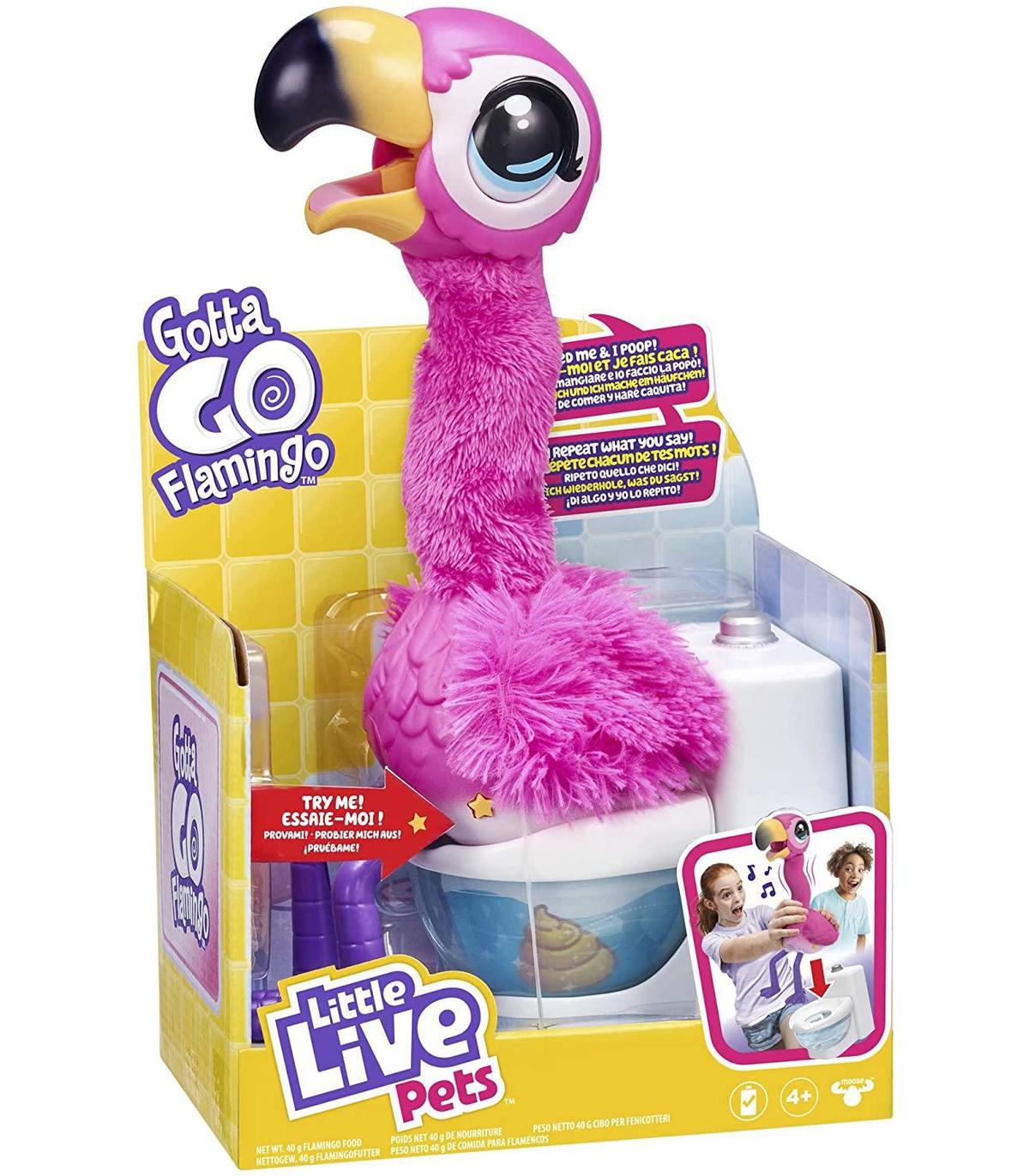 Gotta Go es el flamenco más divertido y moderno. Te hará reír mientras mueve el cuello y repite lo que dices. Después de darle de comer, te hará saber cuándo tiene que ir al baño con una canción muy divertida. Hace caquita en forma de arenilla de color neón. Luego, se saca la arena del W.C y al secarse puedes repetir el juego tantas veces como quieras. Necesita 3 pilas. Medidas aproximadas: 21 x 35,5 x 13,5 cm. Edad recomendada 4 años.