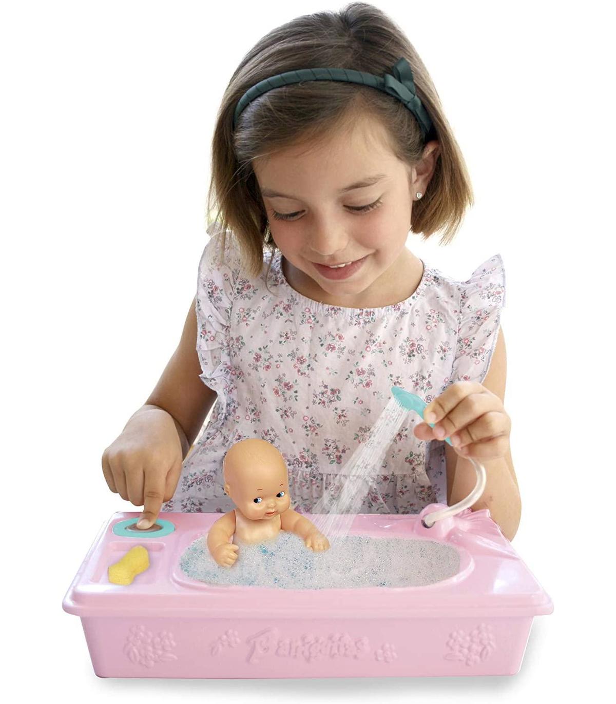La bañera de Barriguitas es para darle un baño a todas tus muñecas Barriguitas Si pulsas el botón, saldrá agua de la alcachofa La bañera se puede llenar de agua y jugar a dar un baño a tu bebé Barriguitas Incluye una figura de bebé vestido con un albornoz y diferentes accesorios para poder bañar a tu Barriguitas Recomendado para niños y niñas mayores de 3 años; la figura mide unos 15 cm; desarrolla la imaginación