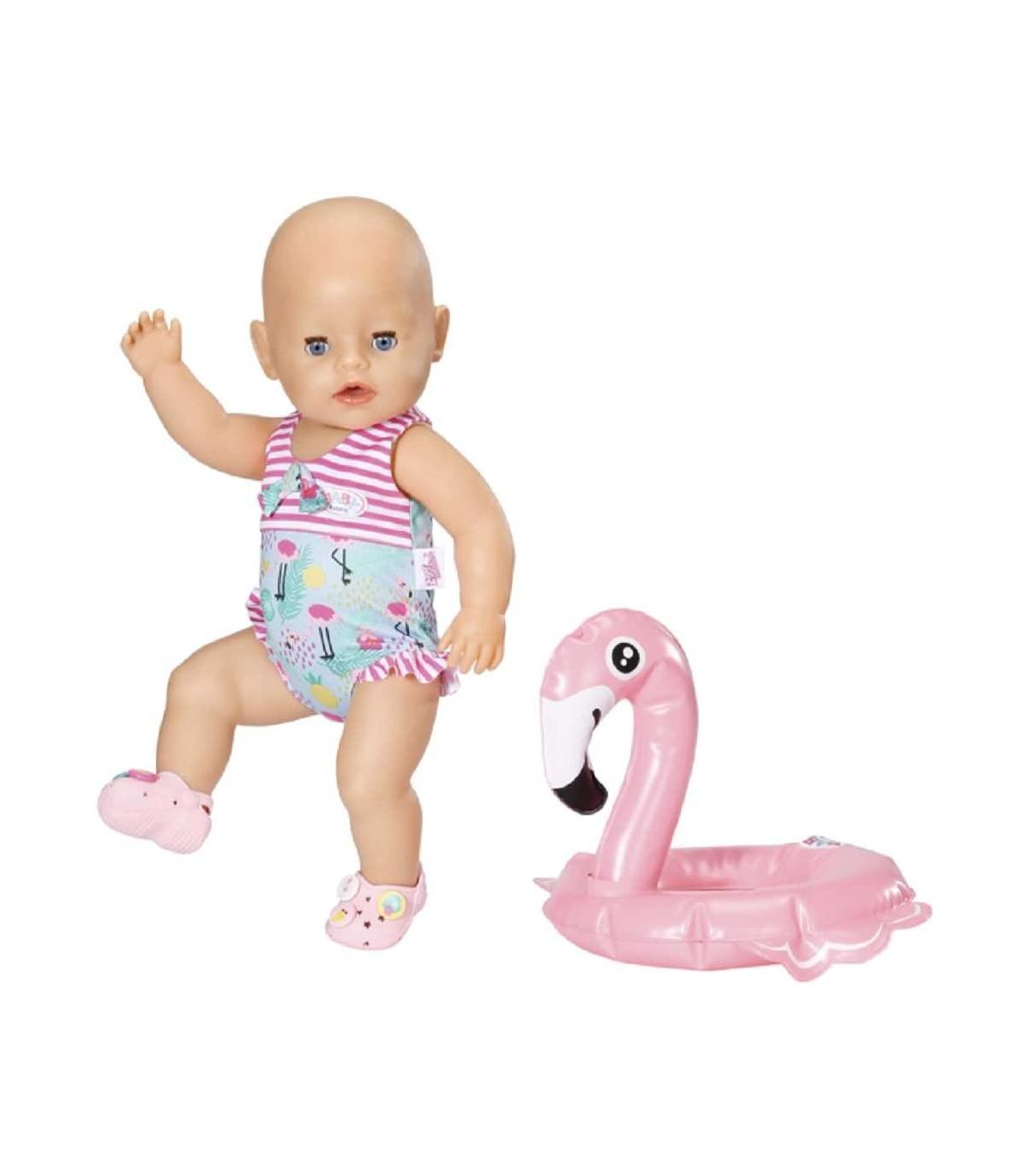 DIVERSIÓN EN FORMA DE FLAMENCO: el bañador es de rayas rosas y blancas con estampado de flamenco; las chanclas son rosas con broches que completan el look mientras BABY born se divierte con la colchoneta en forma de flamenco