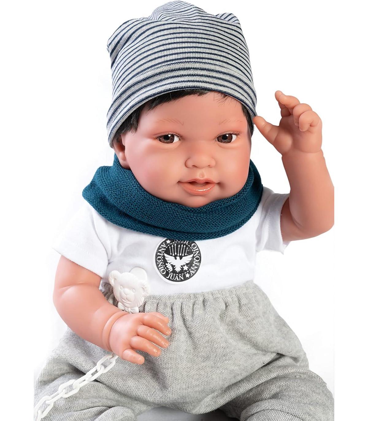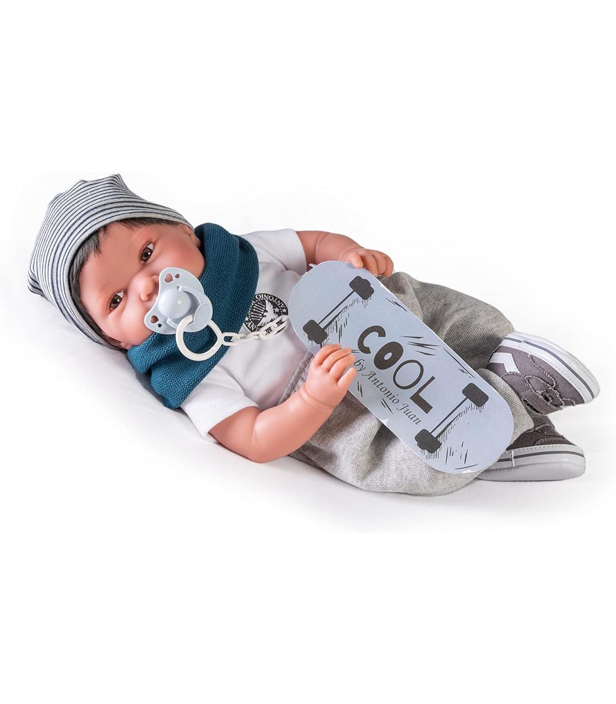 ¡A Pipo le encantá patinar! Y mira que guapo está hoy con su ropita de skater. Le gusta salir al parque a pasear y a jugar con su patín. Su cuerpo es de tela blandito para poder abrazarla suavemente y su cara y extremidades de suave vinilo. Mide 42 cm y pesa 800 gr. ¡Disfrutará mucho contigo allá donde le lleves! Puede colocarse en muchas posiciones como un bebé real porque sus extremidades giran, tiene movimiento, lo que le hace tener más realismo. ¿Hay algo más adorable que un bebé? Los Recién Nacidos son la esencia de Muñecas Antonio Juan. Un universo de dulzura creados para acompañar a los más pequeños a descubrir el mundo. Compañeros inseparables de largos días de juegos a los que no les falta detalle en sus tiernas facciones y calidad de su ropita y complementos.
