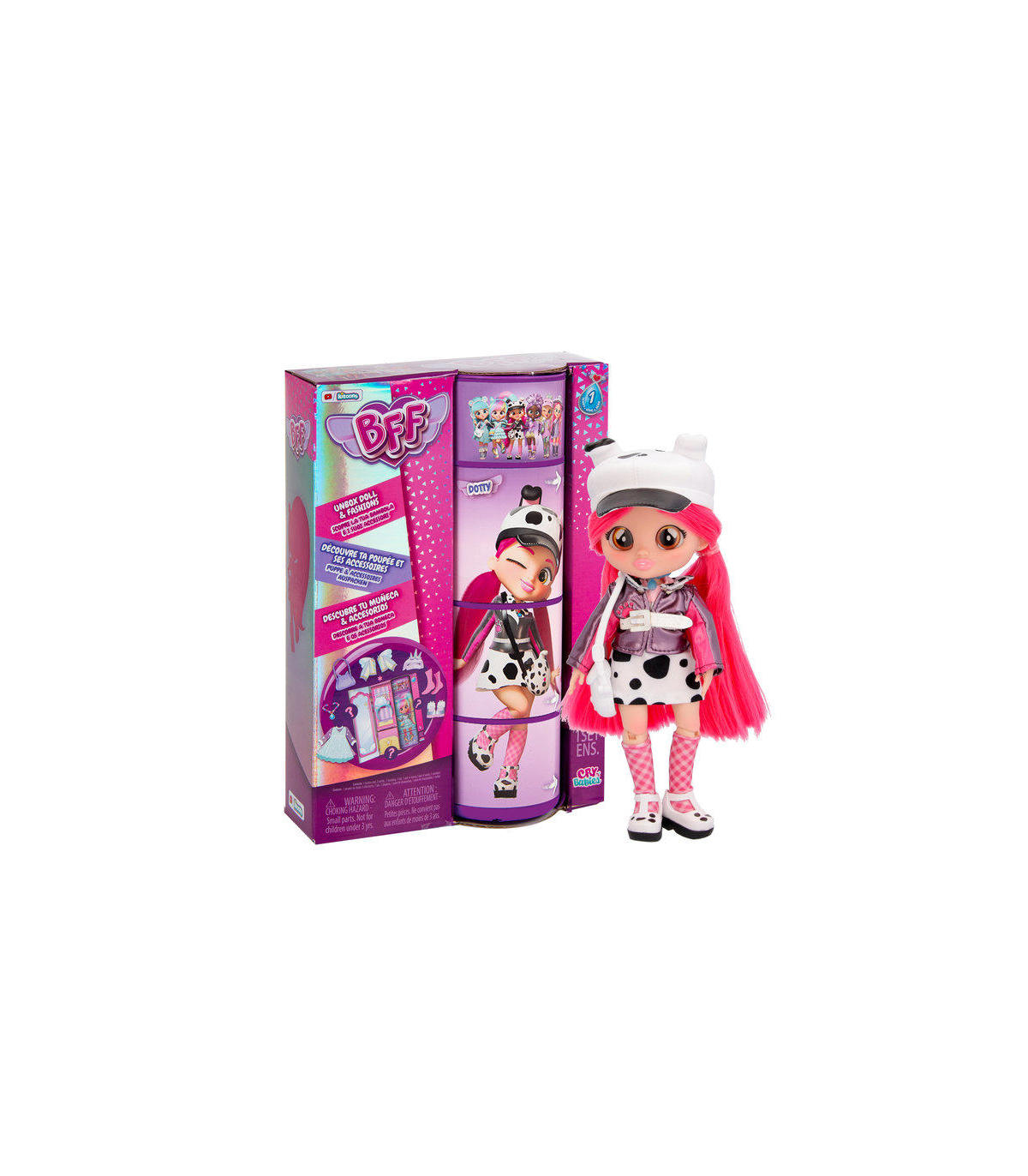 íConoce a la nueva CB BEST FRIENDS FOREVER, Dotty! íAhora tus personajes favoritos de los Bebés Llorones Lágrimas Mágicas han crecido y son adolescentes! Dotty tiene 13 años y vive muchas aventuras junto a sus BFF. Hay 6 personajes para coleccionar, todos visten con ropita de moda. íDotty tiene el pelo largo de nailon, ojos de cristal y el cuerpo articulado! íGira el cilindro para encontrarla! Abre el packaging y descubre su armario con más de 7 sorpresas: 2 prendas de ropa, un bolso, una diadema o un sombrero, unos zapatos a juego con calcetines o medias y íun collar!
