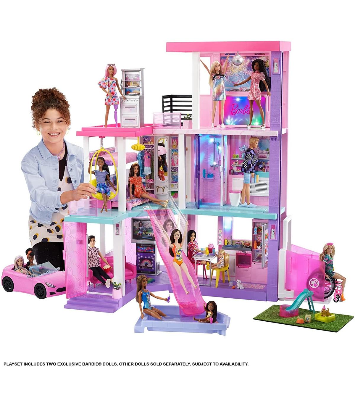 Barbie 60 Aniversario Dreamhouse Casa de muñecas 3 pisos con 10 habitaciones, muebles y más de 70 accesorios, incluye 2 muñecas y un coche, juguete de regalo +3 años (Mattel HCD51)
