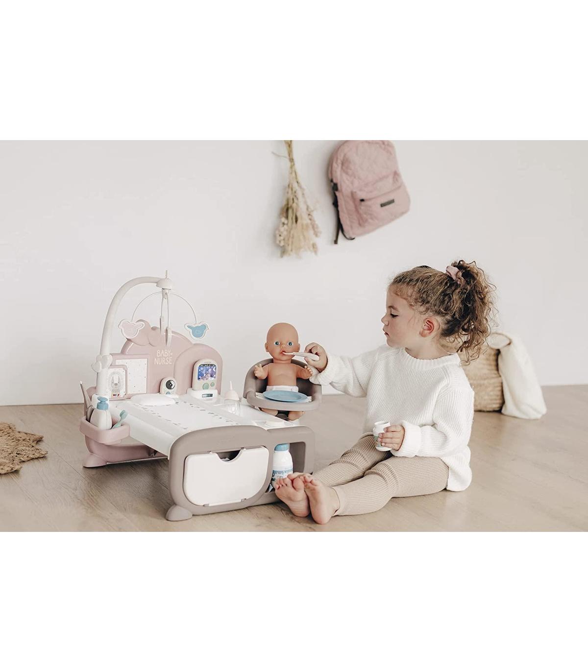 El producto cuenta con una mesa giratoria con una silla, una mesa/cama para cambiar al bebé, un marco de fotos personalizable, un móvil mecánico y varios espacios de almacenamiento.